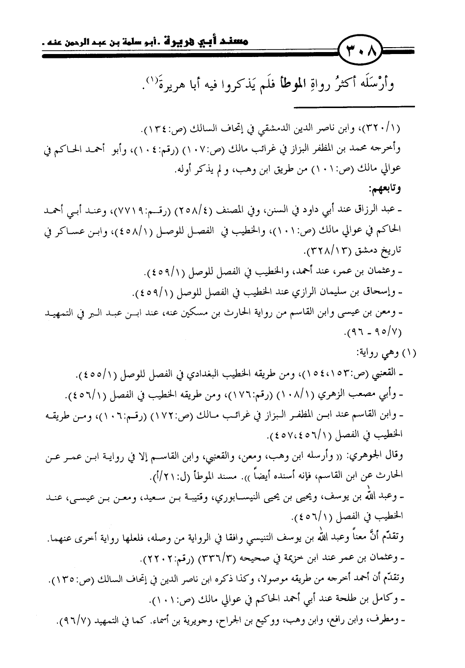 وقال الجوهري: "وأرسله ابن وهب، ومعن، والقعنبي، وابن القاسم إلا في رواية ابن عمر عن الحارث عن ابن القاسم، فإنه أسنده أيضًا". مسند الموطأ (ل: ٢١ / أ).
