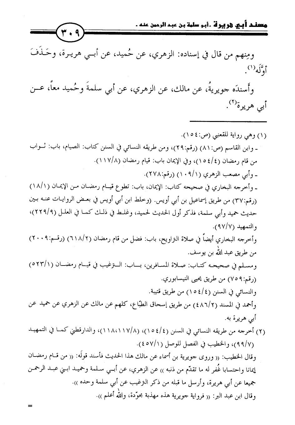 وقال الخطيب: "وروى جويرية بن أسماء عن مالك هذا الحديث فأسند قولَه: "من قام رمضان إيمانا واحتسابا غُفر له ما تقدّم من ذنبه" عن الزهري، عن أبي سلمة وحميد ابني عبد الرحمن جميعا عن أبي هريرة، وأرسل ما قبله من ذكر الترغيب عن أبي سلمة وحده".