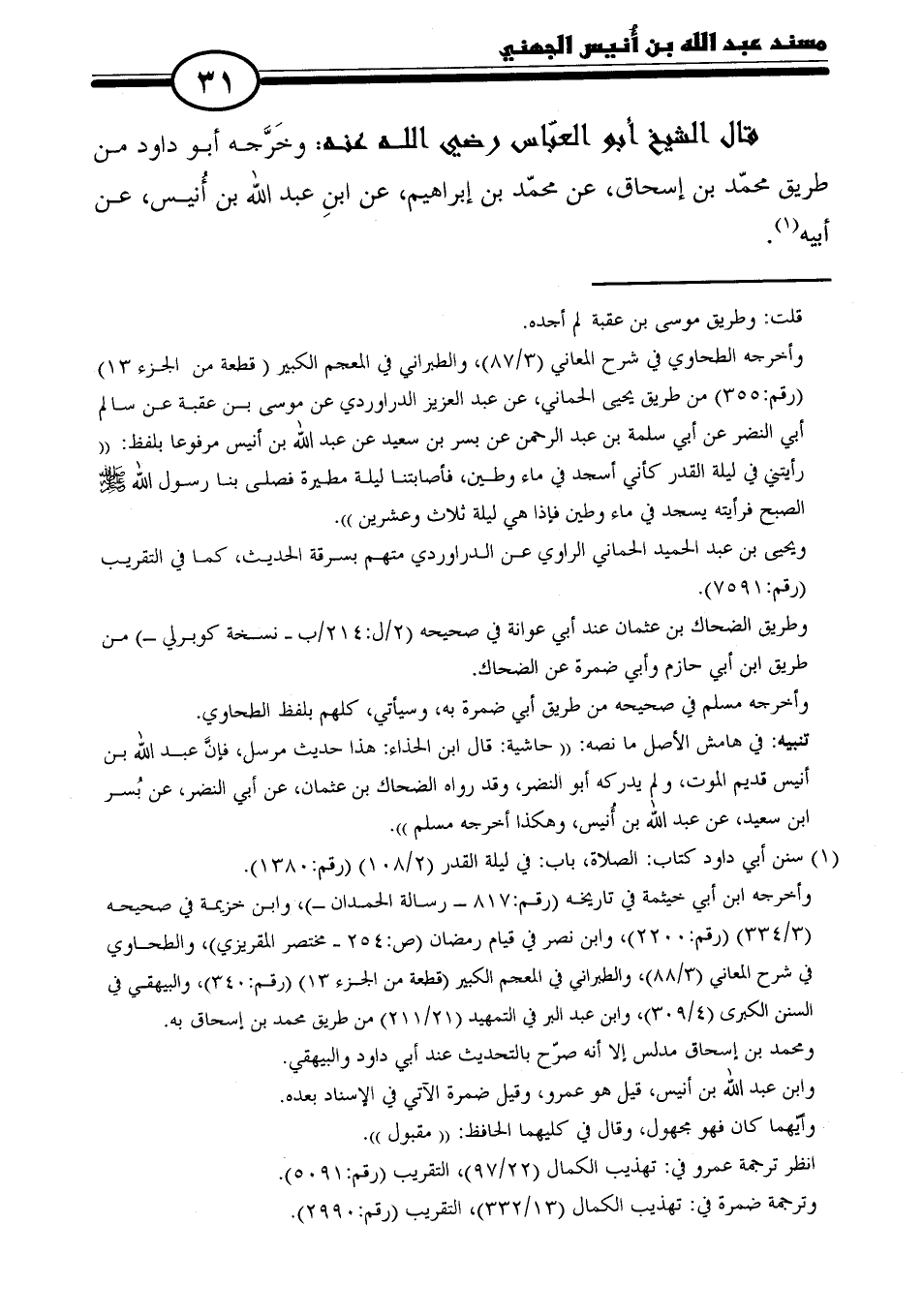 قال الشيخ أبو العبّاس - رضي الله عنه -: وخَرَّجه أبو داود من طريق محمّد بن إسحاق، عن محمّد بن إبراهيم، عن ابنِ عبد الله بن أُنيس، عن أبيه (١).