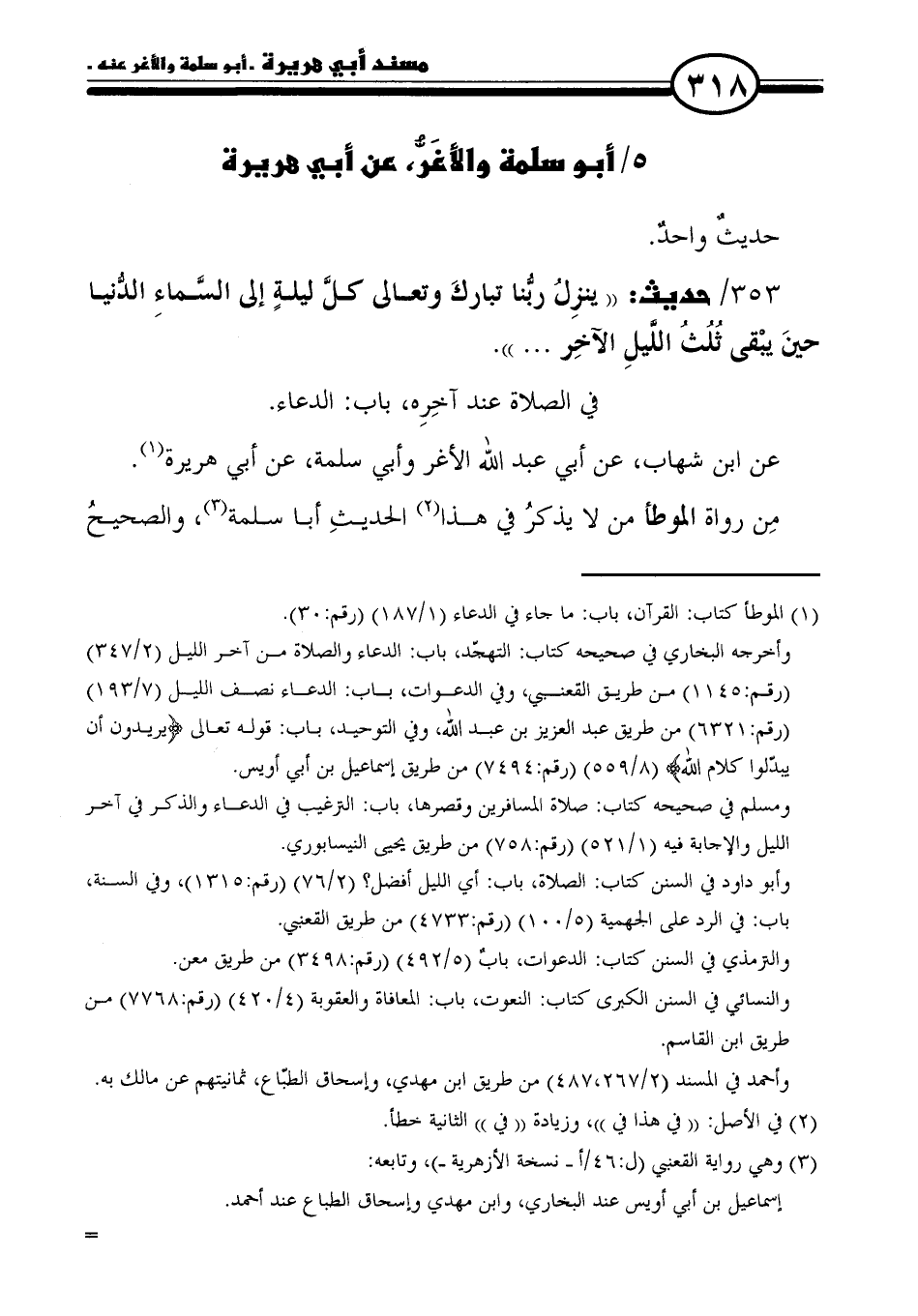 وأخرجه البخاري في صحيحه كتاب: التهجّد، باب: الدعاء والصلاة من آخر الليل (٢/ ٣٤٧) (رقم: ١١٤٥) من طريق القعنبي، وفي الدعوات، باب: الدعاء نصف الليل (٧/ ١٩٣) (رقم: ٦٣٢١) من طريق عبد العزيز بن عبد الله، وفي التوحيد، باب: قوله تعالى {يُرِيدُونَ أَنْ يُبَدِّلُوا كَلَامَ اللَّهِ} (٨/ ٥٥٩) (رقم: ٧٤٩٤) من طريق إسماعيل بن أبي أويس.