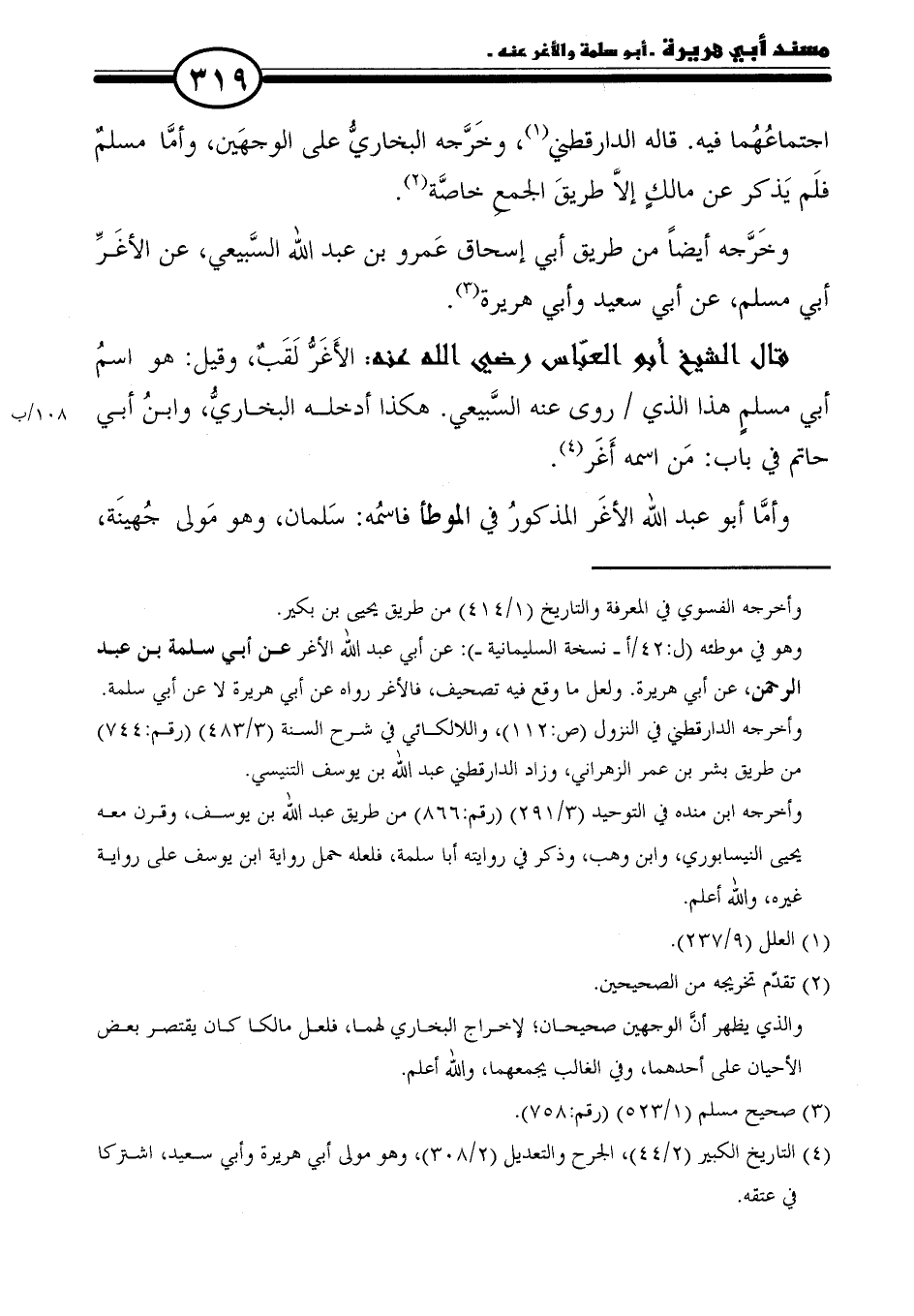قال الشيخ أبو العبَّاس رضي الله عنه: الأَغَرُّ لَقَبٌ، وقيل: هو اسمُ أبي مسلمٍ هذا الذي روى عنه السَّبيعي. هكذا أدخله البخاريُّ، وابنُ أبي حاتم في باب: مَن اسمه أَغَر (٤).