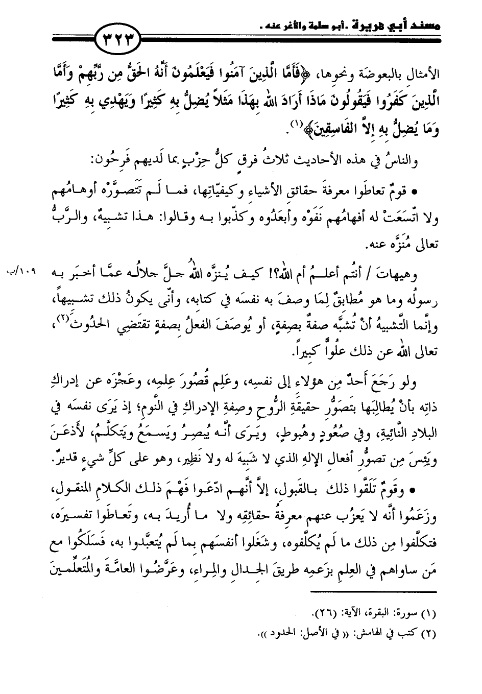 وهيهاتَ أنتُم أعلمُ أم الله؟ ! كيف يُنزَّه اللهُ جلَّ جلالُه عمَّا أخبَر به رسولُه وما هو مُطابقٌ لِمَا وصفَ به نفسَه في كتابه، وأنَّى يكونُ ذلك تشبِيهًا، وإنَّما التَّشبيهُ أنْ تُشَبَّه صفةٌ بصِفةٍ، أو يُوصَفَ الفعَلُ بِصفةٍ تقتَضِي الحدُوثَ (٢)، تعالى الله عن ذلك علُوًّا كبِيرًا.