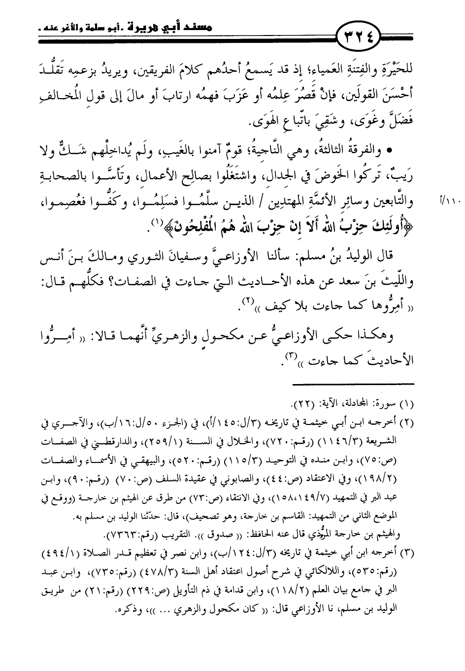 * والفرقةُ الثالثةُ، وهي النَّاجيةُ: قومٌ آمنوا بالغَيبِ، ولَم يُداخِلْهم شَكٌّ ولا رَيبٌ، تَركُوا الخَوضَ في الجدالِ، واشتَغَلُوا بصالِح الأعمالِ، وتَأسَّوا بالصحابةِ والتَّابعين وسائِرِ الأئمَّةِ المهتَدِين الذين سلَّمُوا فسَلِمُوا، وكَفُّوا فعُصِموا، {أُولَئِكَ حِزْبُ الشَّيْطَانِ أَلَا إِنَّ حِزْبَ الشَّيْطَانِ هُمُ الْخَاسِرُونَ} (١).