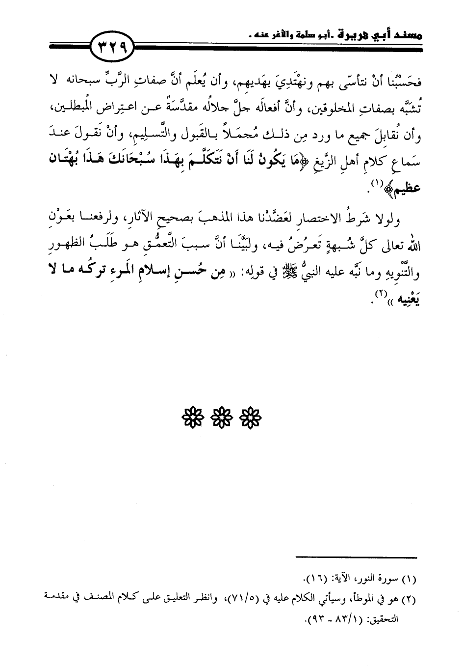 ولولا شَرطُ الاختصارِ لعَضَّدْنا هذا المذهبَ بصحيح الآثارِ، ولرفعنا بعَوْنِ الله تعالى كلَّ شُبهةٍ تَعرُضُ فيه، ولبَيَّنَا أنَّ سببَ التَّعمُّقِ هو طَلَبُ الظهورِ والتَّنْوِيهِ وما نَبَّه عليه النَّبيُّ - صلى الله عليه وسلم - في قولِه: "مِن حُسنِ إسلامِ المَرءِ تركه ما لا يَعْنِيه" (٢).