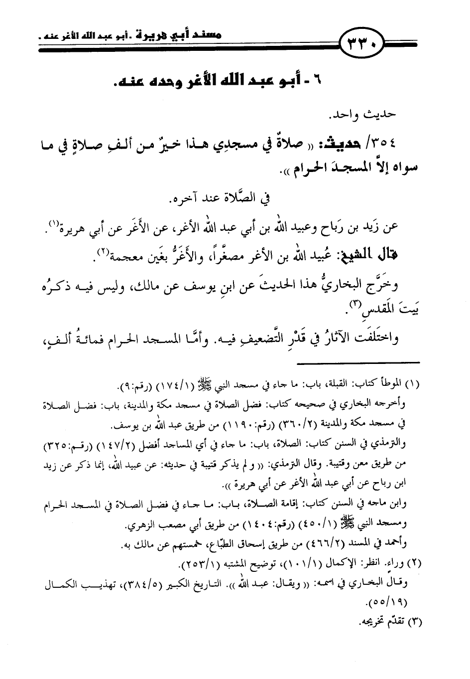 ٣٥٤/ حديث: "صلاةٌ في مسجدِي هذا خيرٌ من ألفِ صلاةٍ في ما سواه إلَّا المسجدَ الحرام".