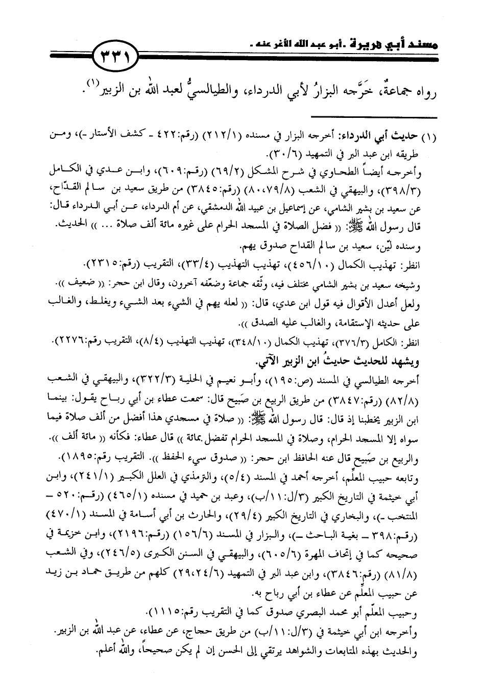 (١) حديث أبي الدرداء: أخرجه البزار في مسنده (١/ ٢١٢) (رقم: ٤٢٢ - كشف الأستار-)، ومن طريقه ابن عبد البر في التمهيد (٦/ ٣٠).