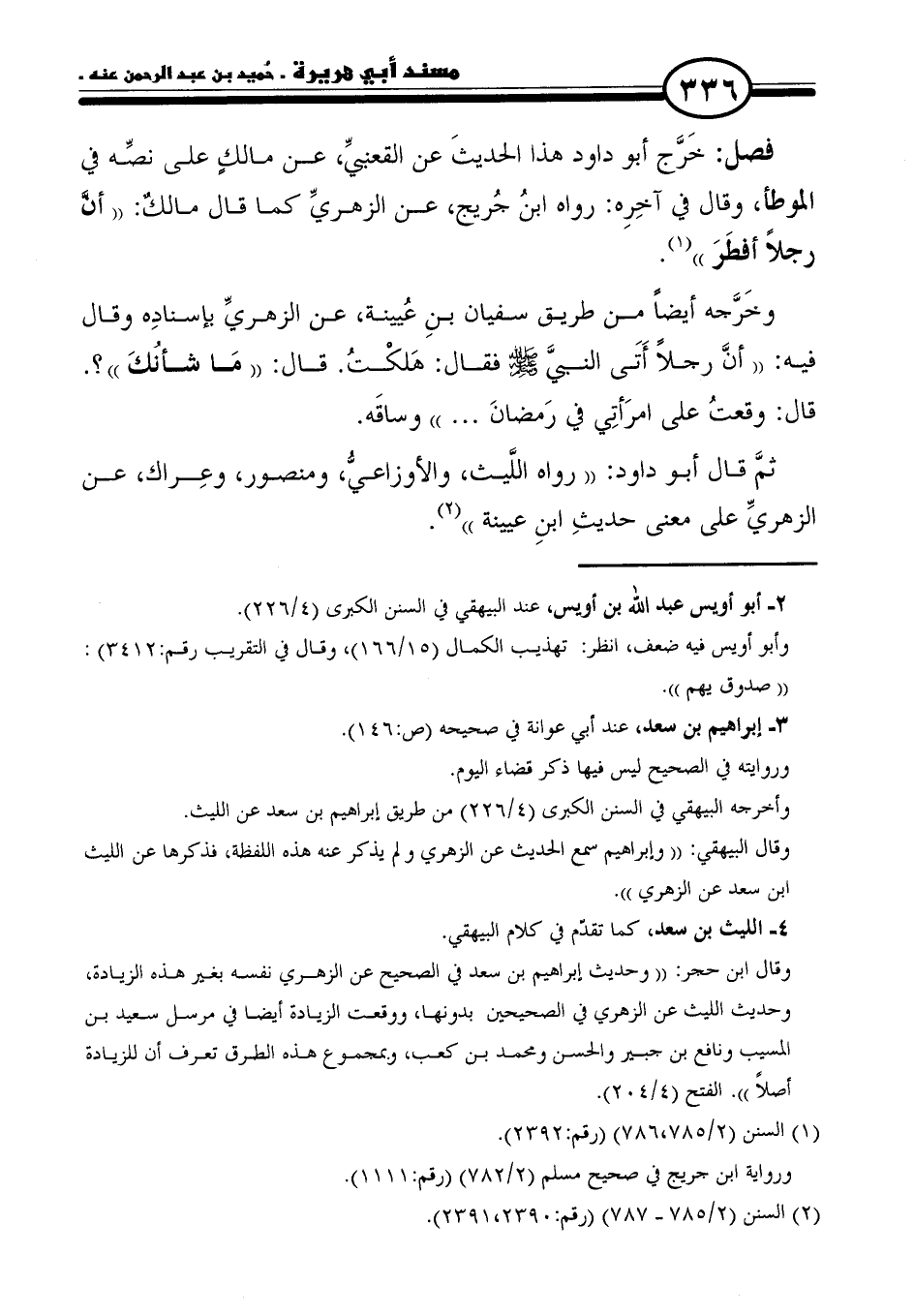فصل: خَرَّج أبو داود هذا الحديث عن القعنبيِّ، عن مالكٍ على نصِّه في الموطأ، وقال في آخِرِه: رواه ابنُ جُريج، عن الزهريِّ كما قال مالكٌ: "أنَّ رجلًا أفطَرَ" (١).