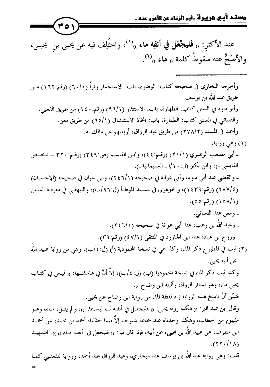(٢) ثبت في المطبوع ذكر الماء، وكذا هي في نسخة المحمودية (أ) (ل: ٤/ ب)، وهى من رواية عبيد الله عن أبيه يحيى.