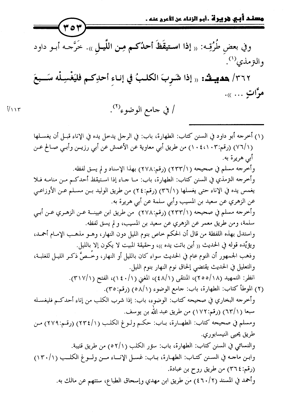 ٣٦٢/ حديث: "إذا شَرِبَ الكلبُ في إناءِ أحدِكم فليَغْسِلْه سَبعَ مرَّاتٍ. . . ".