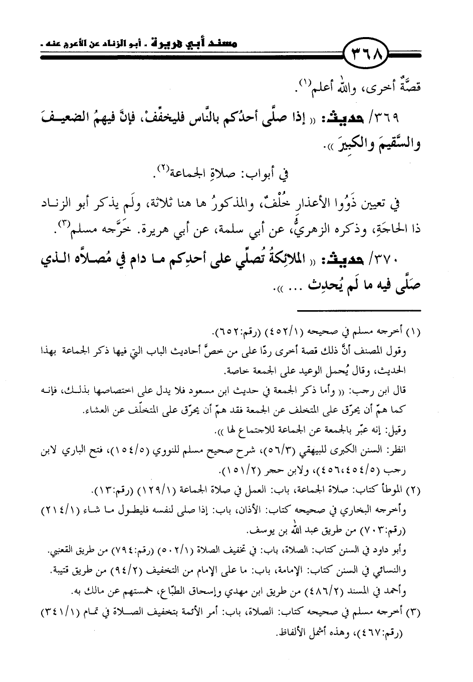 ٣٦٩/ حديث: "إذا صلَّى أحدُكم بالنَّاس فليخفِّفْ، فإنَّ فيهمُ الضعيفَ والسَّقيمَ والكبِيرَ".
