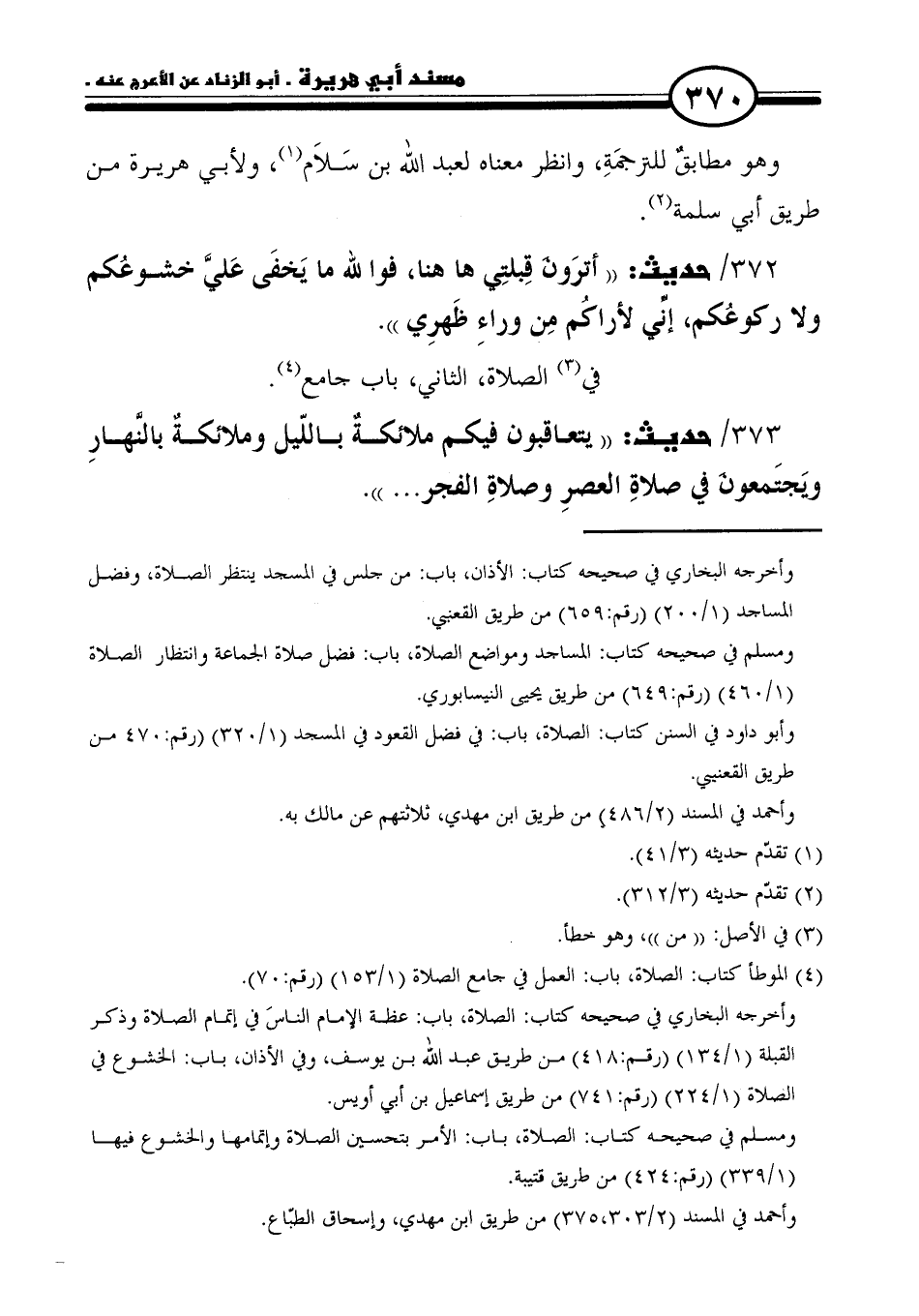 ٣٧٢/ حديث: "أترَون قِبلتِي ها هنا، فوالله ما يَخفَى عَليَّ خشوعُكم ولا ركوعُكم، إنِّي لأراكُم مِن وراءِ ظَهرِي".