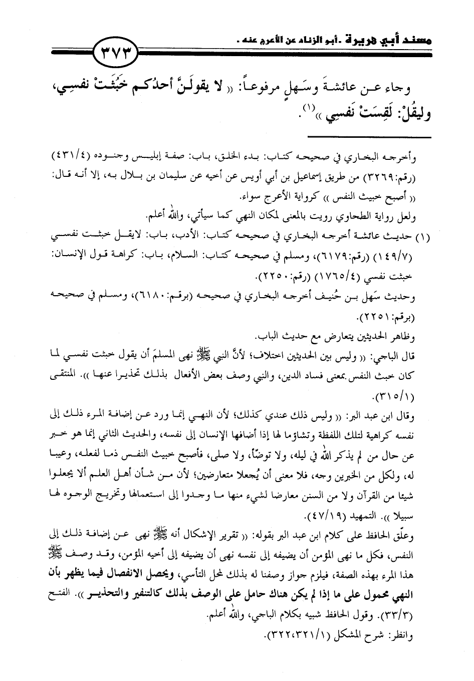 وعلّق الحافظ على كلام ابن عبد البر بقوله: "تقرير الإشكال أنه - صلى الله عليه وسلم - نهى عن إضافة ذلك إلى النفس، فكل ما نهى المؤمن أن يضيفه إلى نفسه نهى أن يضيفه إلى أخيه المؤمن، وقد وصف - صلى الله عليه وسلم - هذا المرء بهذه الصفة، فيلزم جواز وصفنا له بذلك لمحل التأسي، ويحصل الانفصال فيما يظهر بأن النهي محمول على ما إذا لم يكن هناك حامل على الوصف بذلك كالتنفير والتحذير". الفتح (٣/ ٣٣). وقول الحافظ شبيه بكلام الباجي، والله أعلم.