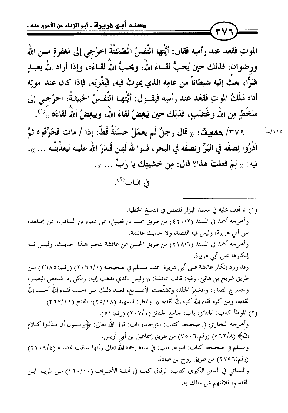 ٣٧٩/ حديث: "قال رجلٌ لَم يعمَلْ حسَنَةً قَطّ: إذا مات فحَرِّقوه ثمَّ آذْرُوا نِصفَه في البَرِّ ونصفَه في البحر، فوالله لَئِن قَدَرَ الله عليه ليعذِّبنَّه. . . ". فيه: "لِمَ فعلتَ هذا؟ قال: مِن خشيتِك يا رَبِّ. . . ".