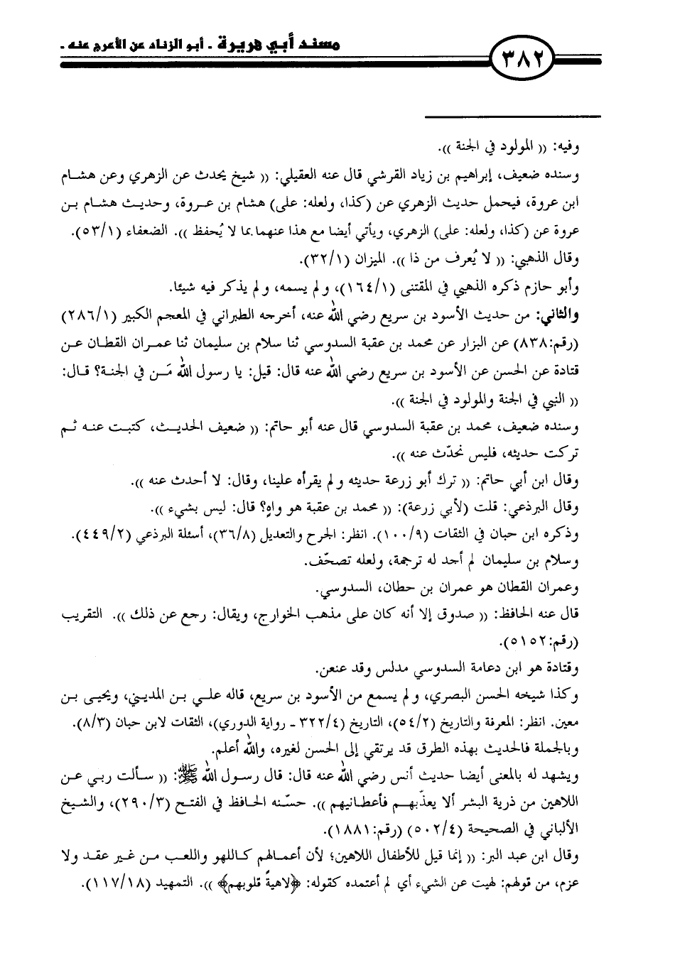 والثاني: من حديث الأسود بن سريع رضى الله عنه، أخرجه الطبراني في المعجم الكبير (١/ ٢٨٦) (رقم: ٨٣٨) عن البزار عن محمد بن عقبة السدوسي ثنا سلام بن سليمان ثنا عمران القطان عن قتادة عن الحسن عن الأسود بن سريع رضى الله عنه قال: قيل: يا رسول الله مَن في الجنة؟ قال: "النبي في الجنة والمولود في الجنة".