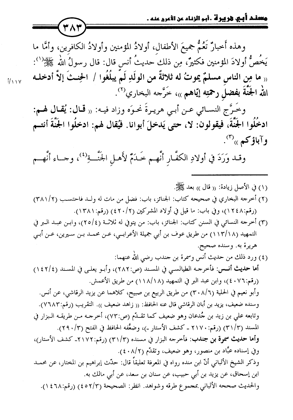 (٣) أخرجه النسائي في السنن كتاب: الجنائز، باب: من يتوفي له ثلاثة (٤/ ٢٥)، وابن عبد البر في التمهيد (١٨/ ١١٣) من طريق عوف بن أبي جميلة الأعرابي، عن محمد بن سيرين، عن أبي هريرة به. وسنده صحيح.