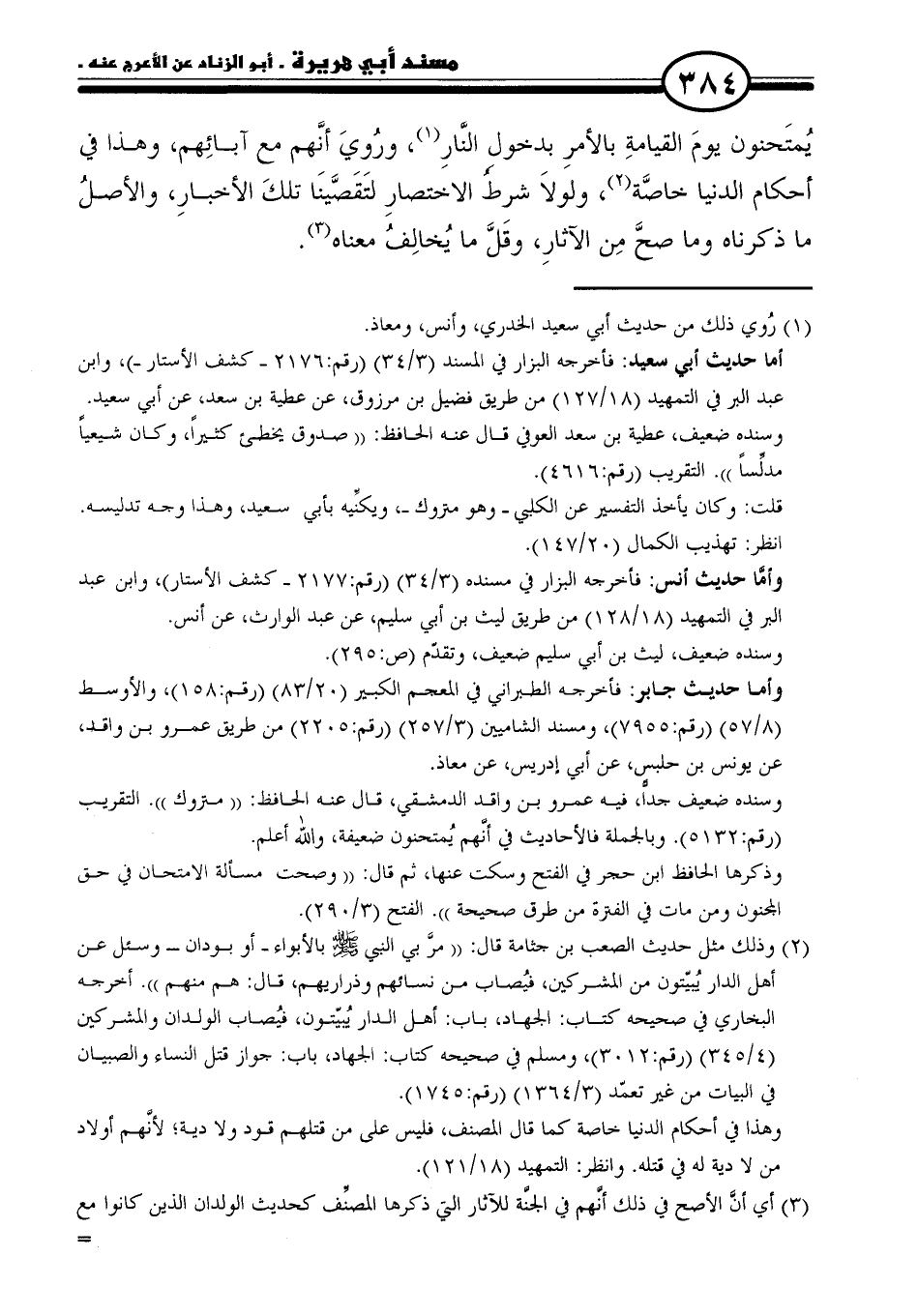 يُمتَحنون يومَ القيامةِ بالأمرِ بدخول النَّارِ (١)، ورُويَ أنَّهم مع آبائِهم، وهذا في أحكام الدنيا خاصَّة (٢)، ولولَا شرط الاختصارِ لتَقَصَّينَا تلكَ الأخبارِ، والأصلُ ما ذكرناه وما صحَّ مِن الآثارِ، وقَلَّ ما يُخالِفُ معناه (٣).