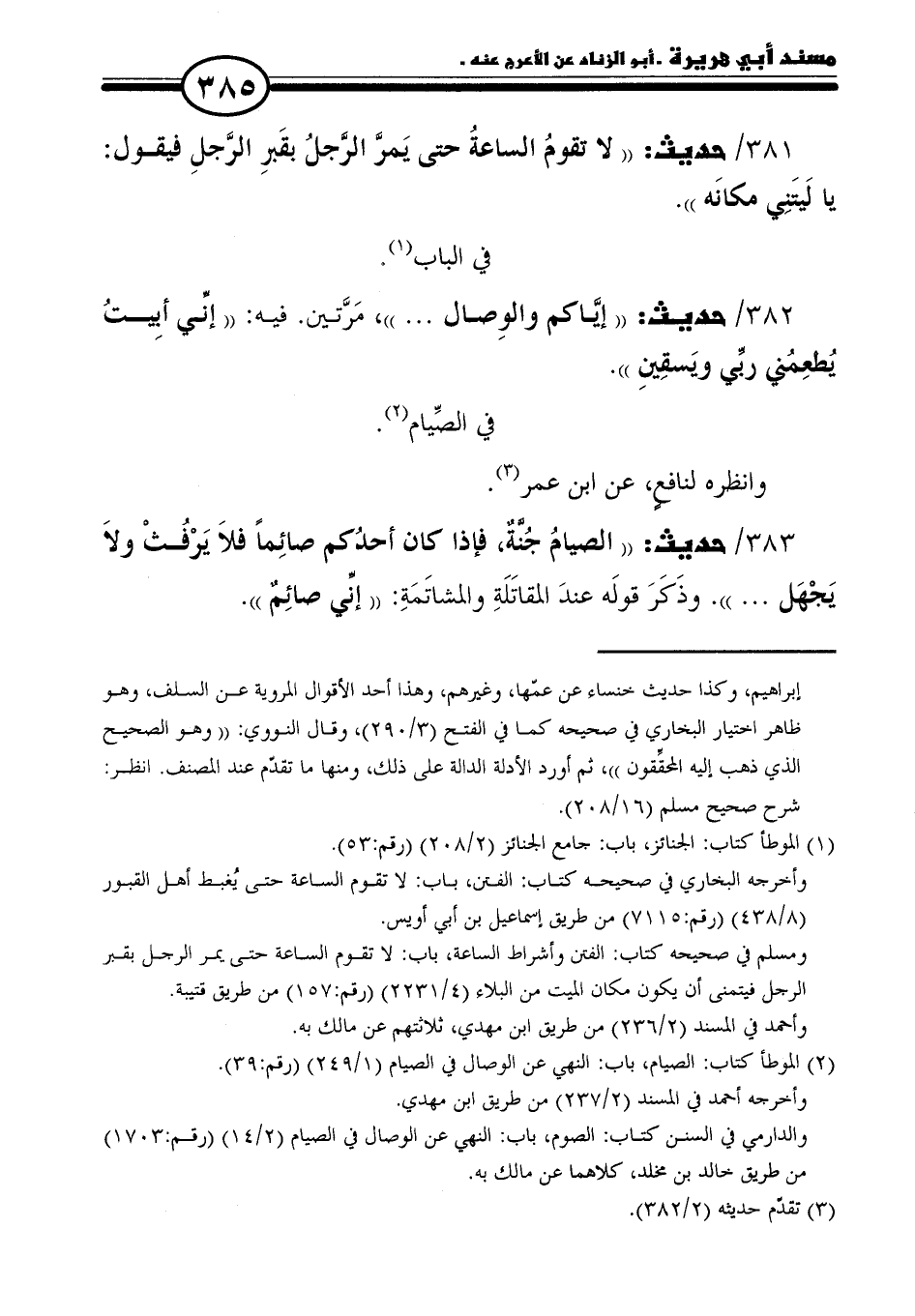٣٨٣/ حديث: "الصيامُ جُنَّةٌ، فإذا كان أحدُكم صائِمًا فلَا يَرْفثْ ولَا يَجْهَل. . . ". وذَكَرَ قولَه عندَ المقاتَلَةِ والمشاتَمَةِ: "إنِّي صائِمٌ".