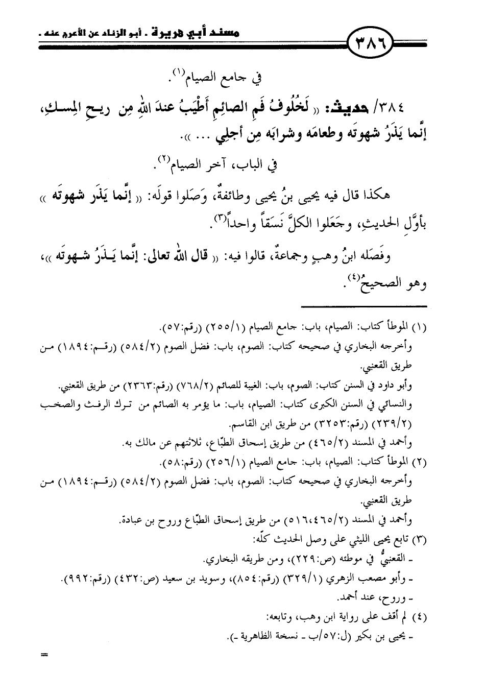 ٣٨٤/ حديث: "لَخُلُوفُ فَمِ الصائِمِ أَطْيَبُ عندَ اللهِ مِن ريحِ المِسكِ، إنَّما يَذَرُ شهوتَه وطعامَه وشرابَه مِن أجلِي. . . ".
