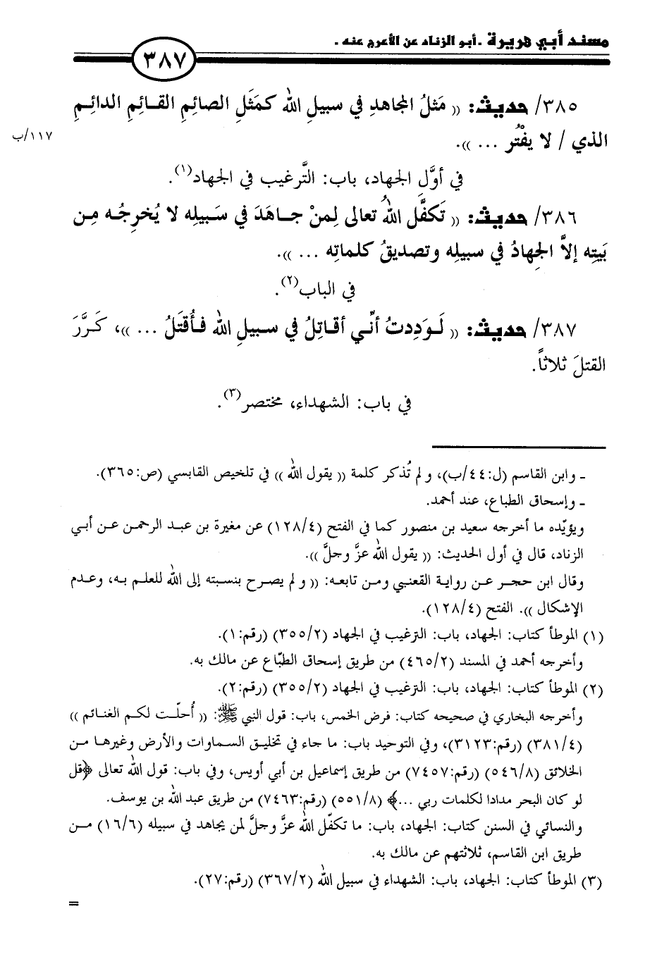٣٨٧/ حديث: "لَوَدِدتُ أنِّي أقاتِلُ في سبيلِ الله فأُقتَلُ. . . "، كَرَّرَ القتلَ ثلاثًا.