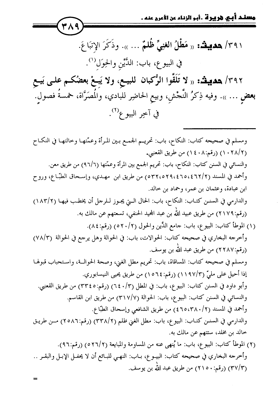 ٣٩٢/ حديث: "لا تَلَقَّوا الرّكبان للبيعِ، ولا يَبِعْ بعضكم على بَيعِ بعضٍ. . . ". وفيه ذِكرُ النَّجْشِ، وبيع الحاضِر للبادي، والمُصَرَّاة، خمسةُ فصولٍ.