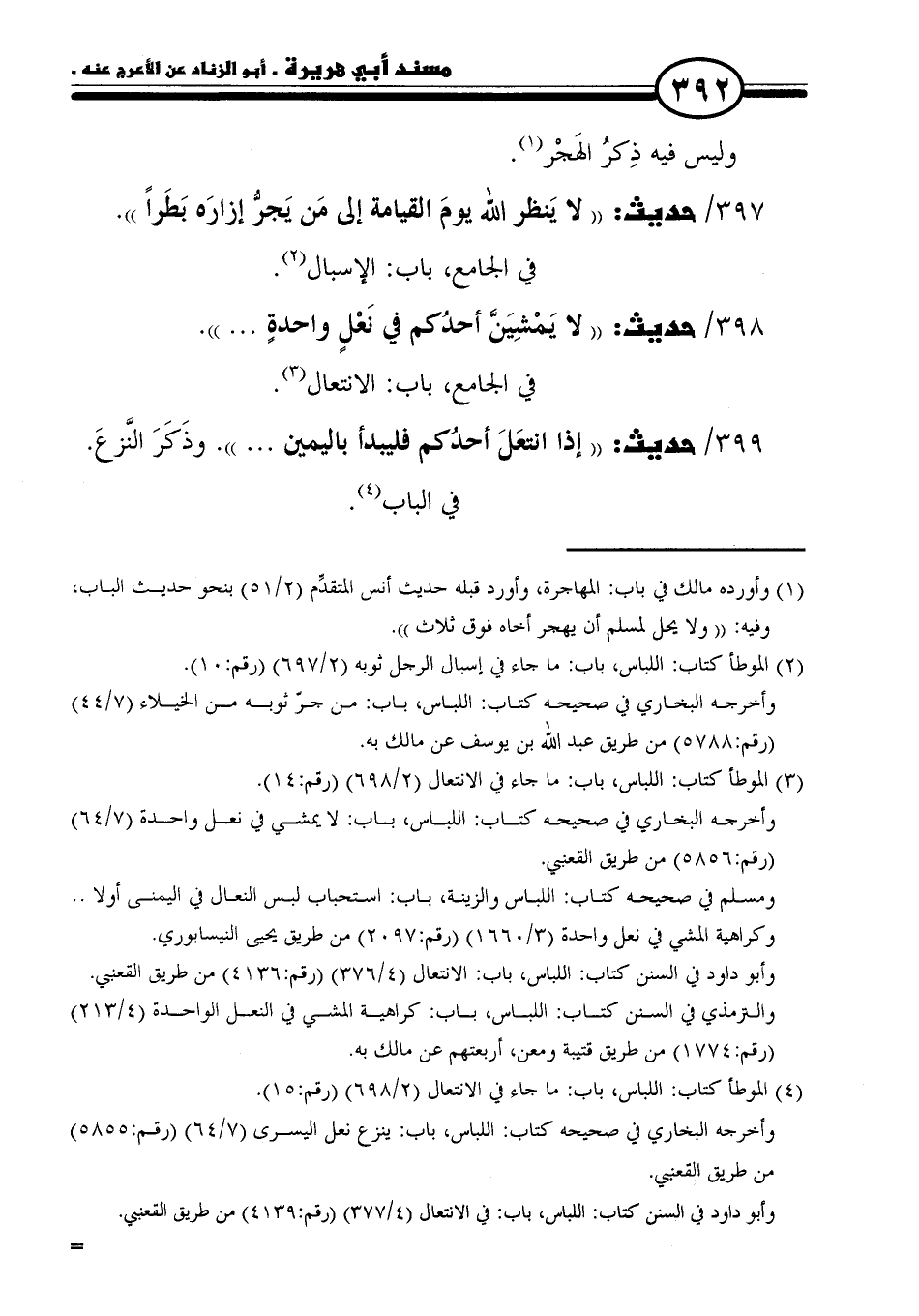 ٣٩٨/ حديث: "لا يَمْشِيَنَّ أحدُكم في نَعْلٍ واحدةٍ. . . ".