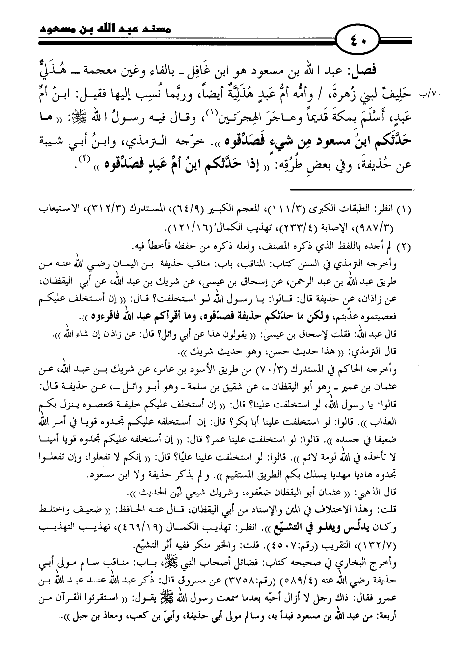 فصل: عبد الله بن مسعود هو ابن غَافِل -بالفاء وغين معجمة- هُذَليٌّ حَلِيفٌ لبني زُهرةَ، وأمُّه أمُّ عَبدٍ هُذَلِيَّة أيضًا، وربَّما نُسِب إليها فقيل: ابنُ أمّ عَبدٍ, أَسْلَمَ بِمكةَ قَديمًا وهاجَرَ الهِجرَتنِن (١)، وقال فيه رسولُ الله - صلى الله عليه وسلم -: "ما حَدَّثَكم ابنُ مسعود مِن شيء فصَدّقوه". خرّجه الترمذي، وابنُ أبي شيبة عن حُذيفةَ، وفي بعضِ طُرُقِه: "إذا حَدَّثكم ابنُ أمّ عَبدٍ فصَدّقوه" (٢).