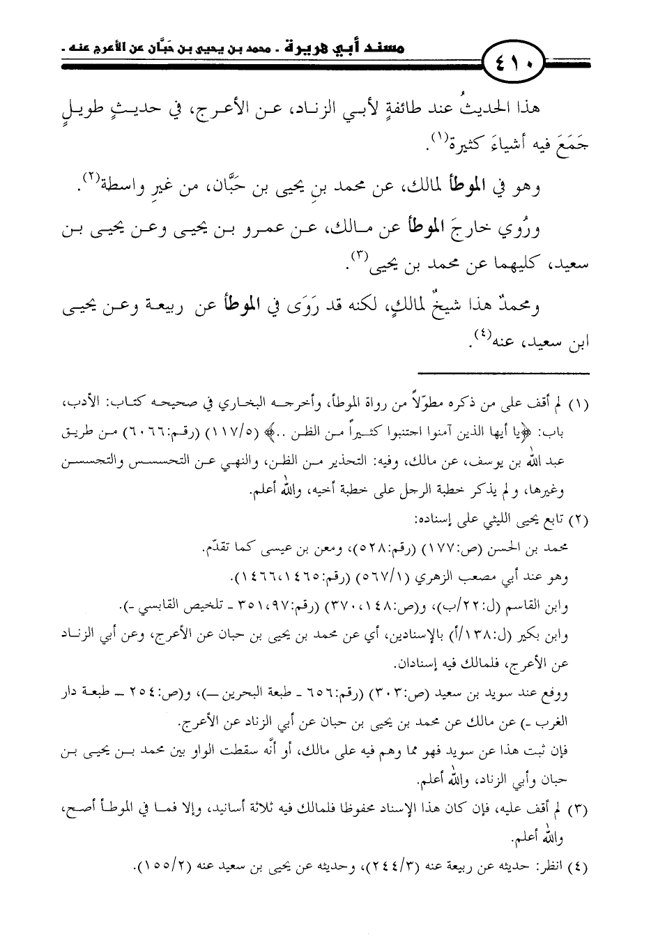 ووقع عند سويد بن سعيد (ص: ٣٠٣) (رقم: ٦٥٦ - طبعة البحرين-)، و (ص: ٢٥٤ - طبعة دار الغرب-) عن مالك عن محمد بن يحيى بن حبان عن أبي الزناد عن الأعرج.