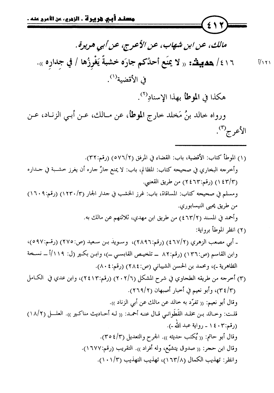 ٤١٦/ حديث: "لا يمنَع أحدُكم جارَه خشبةً يَغْرِزُها في جِدارِه".
