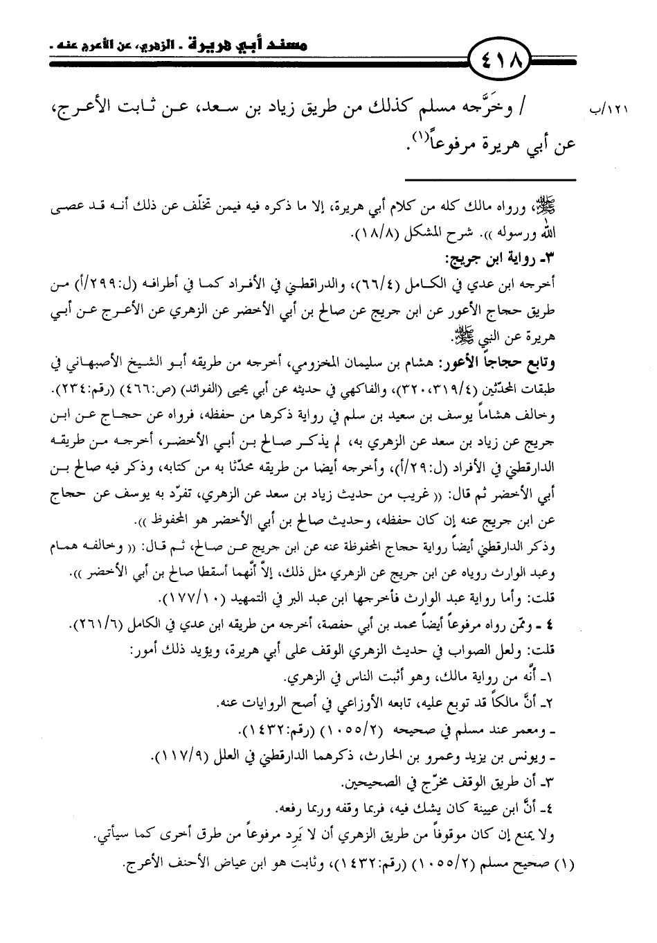 قلت: ولعل الصواب في حديث الزهري الوقف على أبي هريرة، ويؤيد ذلك أمور: