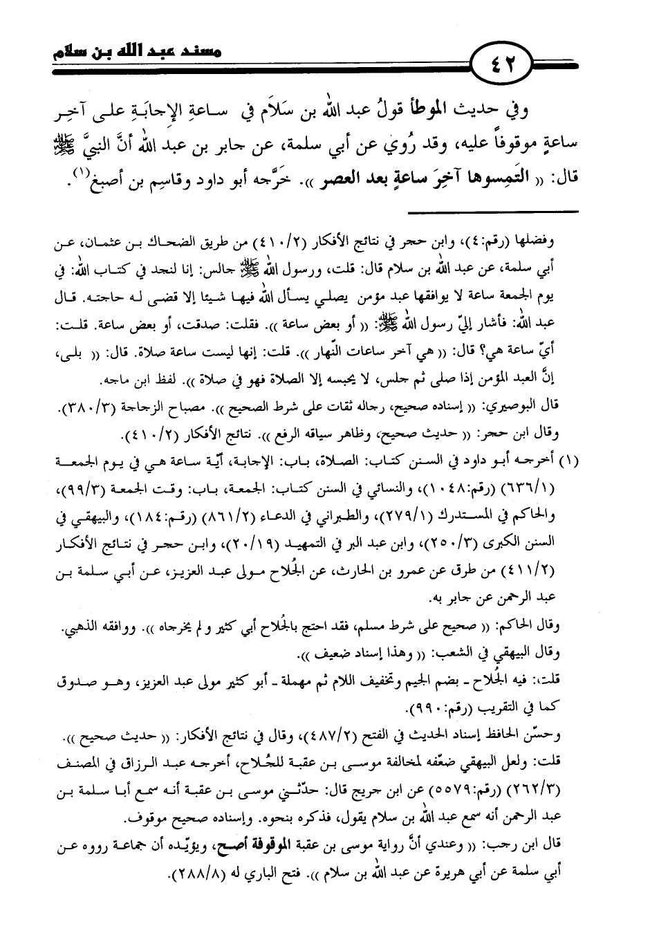 وفي حديث الموطأ قولُ عبد الله بن سَلاَم في ساعةِ الإِجابَةِ على آخِر ساعةٍ موقوفًا عليه، وقد رُوي عن أبي سلمة، عن جابر بن عبد الله أنَّ النبيَّ - صلى الله عليه وسلم - قال: "التَمِسوها آخِرَ ساعةٍ بعد العصر". خَرَّجه أبو داود وقاسِم بن أصبغ (١).
