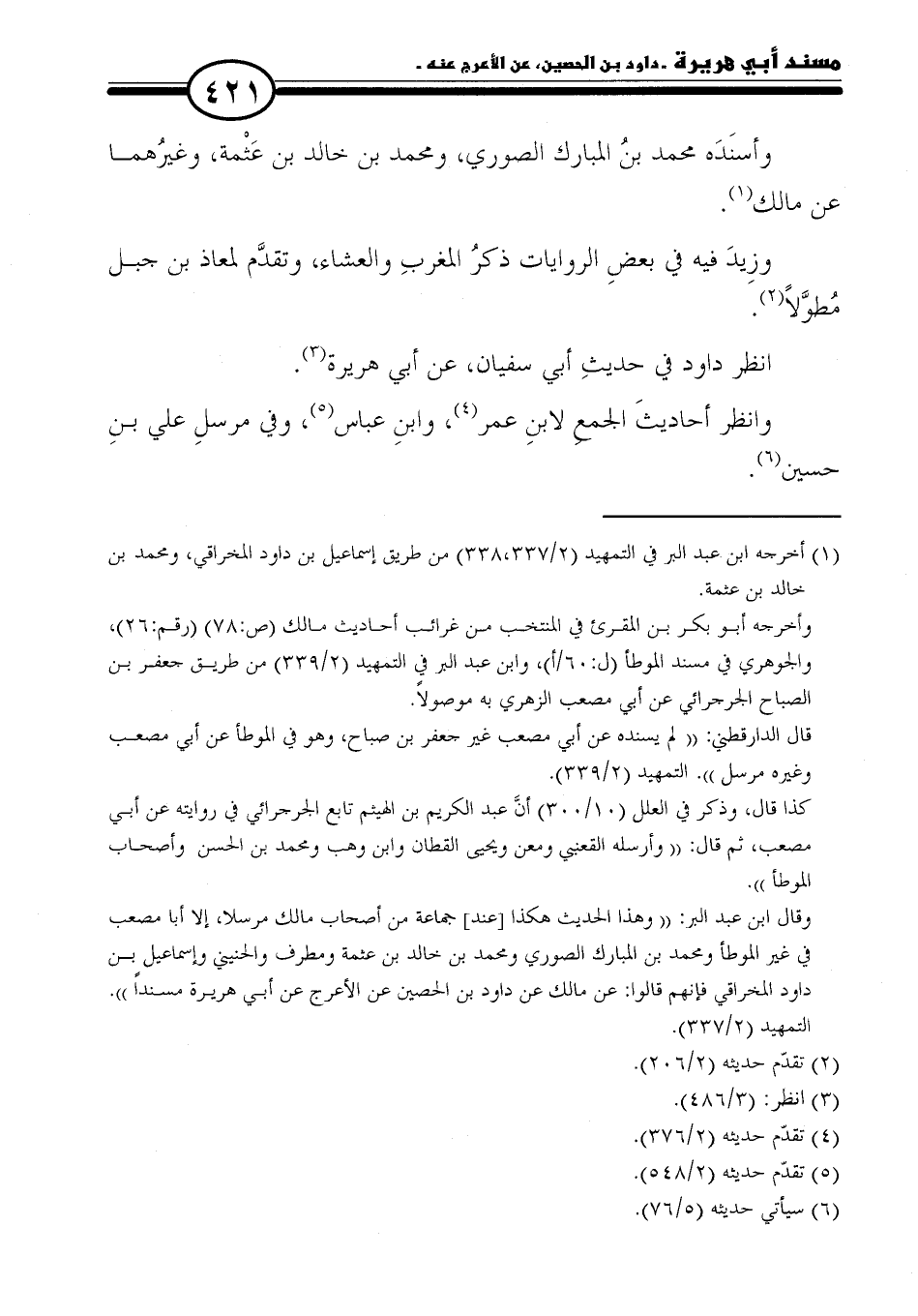 وقال ابن عبد البر: "وهذا الحديث هكذا [عند] جماعة من أصحاب مالك مرسلا، إلا أبا مصعب في غير الموطأ ومحمد بن المبارك الصوري ومحمد بن خالد بن عثمة ومطرف والحنيني وإسماعيل بن داود المخراقي فإنهم قالوا: عن مالك عن داود بن الحصين عن الأعرج عن أبي هريرة مسندًا". التمهيد (٢/ ٣٣٧).