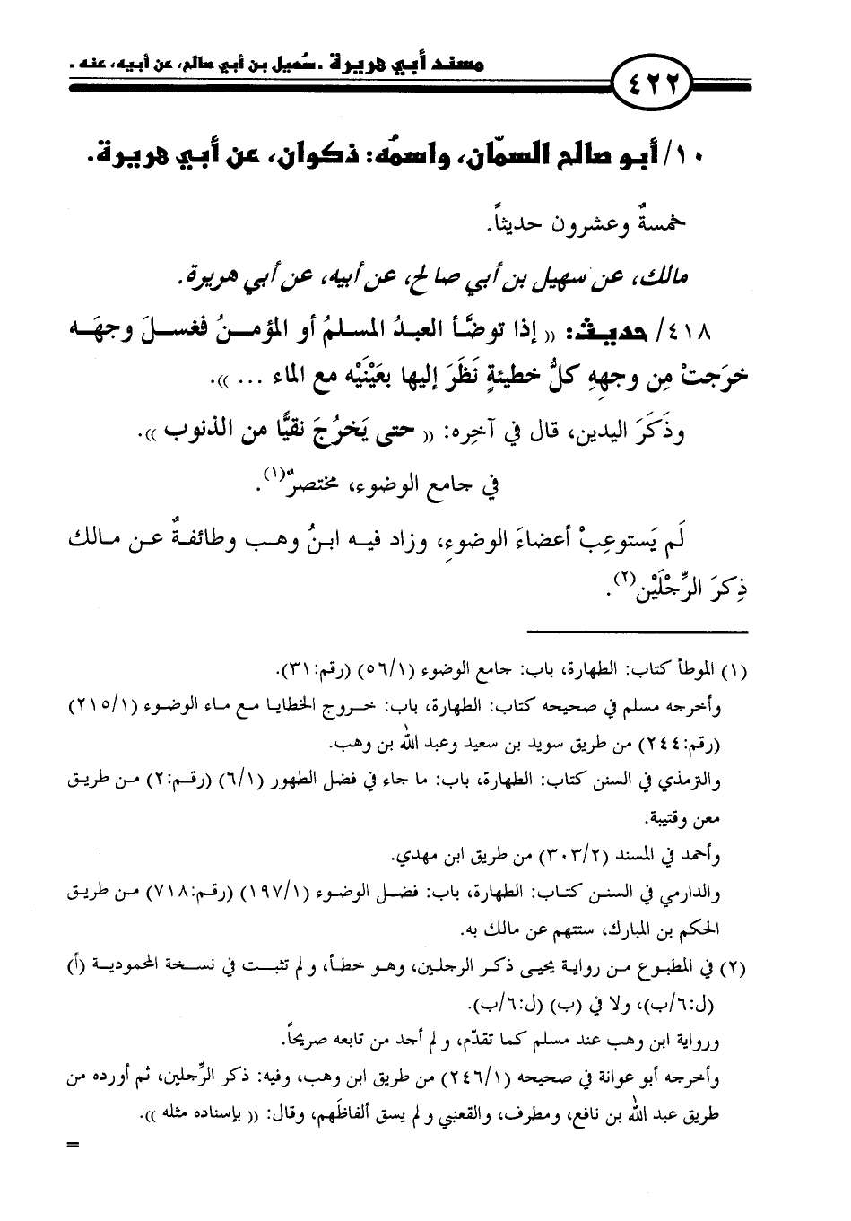 (١) الموطأ كتاب: الطهارة، باب: جامع الوضوء (١/ ٥٦) (رقم: ٣١).