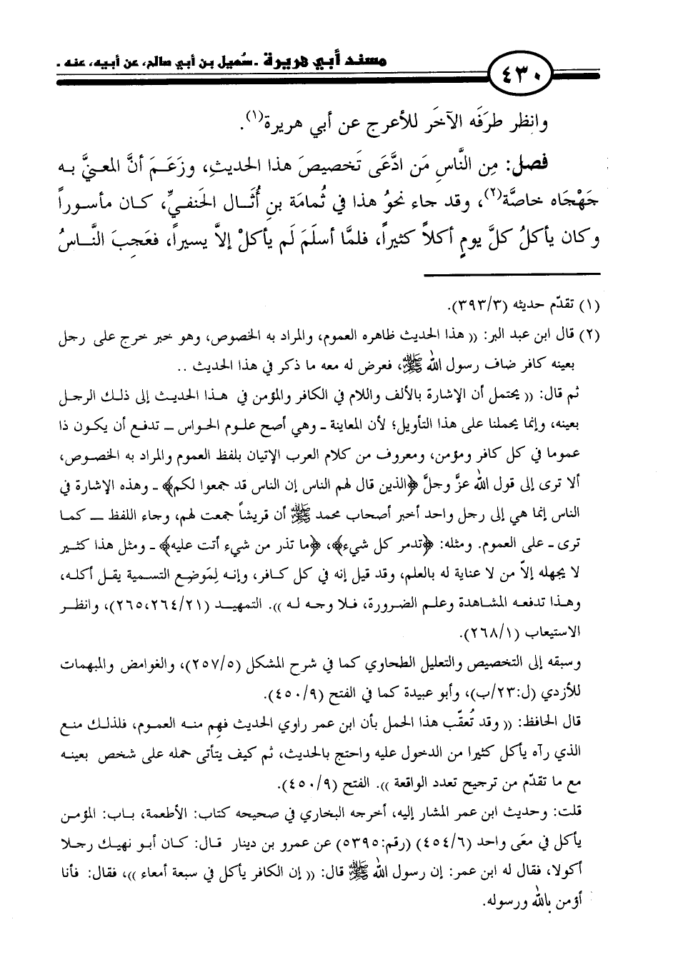 ثم قال: "يحتمل أن الإشارة بالألف واللام في الكافر والمؤمن في هذا الحديث إلى ذلك الرجل بعينه، وإنما يحملنا على هذا التأويل، لأن المعاينة -وهي أصح علوم الحواس- تدفع أن يكون ذا عموما في كل كافر ومؤمن، ومعروف من كلام العرب الإتيان بلفظ العموم والمراد به الخصوص، ألا ترى إلى قول الله عز وجلَّ {الَّذِينَ قَالَ لَهُمُ النَّاسُ إِنَّ النَّاسَ قَدْ جَمَعُوا لَكُمْ} -وهذه الإشارة في الناس إنما هي إلى رجل واحد أخبر أصحاب محمد - صلى الله عليه وسلم - أن قريشًا جمعت لهم، وجاء اللفظ -كما ترى- على العموم. ومثله: {تُدَمِّرُ كُلَّ شَيْءٍ}، {مَا تَذَرُ مِنْ شَيْءٍ أَتَتْ عَلَيْهِ} -ومثل هذا كثير لا يجهله إلّا من لا عناية له بالعلم، وقد قيل إنه في كل كافر، وإنه لِمَوضِع التسمية يقل أكله، وهذا تدفعه المشاهدة وعلم الضرورة، فلا وجه له". التمهيد (٢١/ ٢٦٤، ٢٦٥)، وانظر الاستيعاب (١/ ٢٦٨).