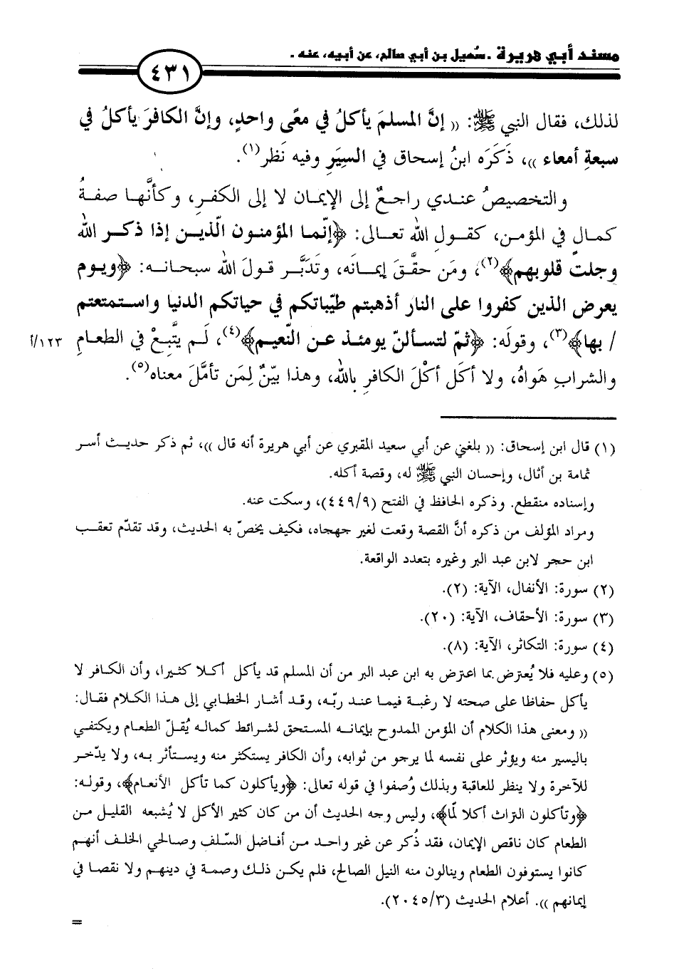 لذلك، فقال النبي - صلى الله عليه وسلم -: "إنَّ المسلمَ يأكل في معًى واحدٍ، وإنَّ الكافرَ يأكلُ في سبعةِ أمعاء"، ذَكَرَه ابنُ إسحاق في السِيَرِ وفيه نَظر (١).