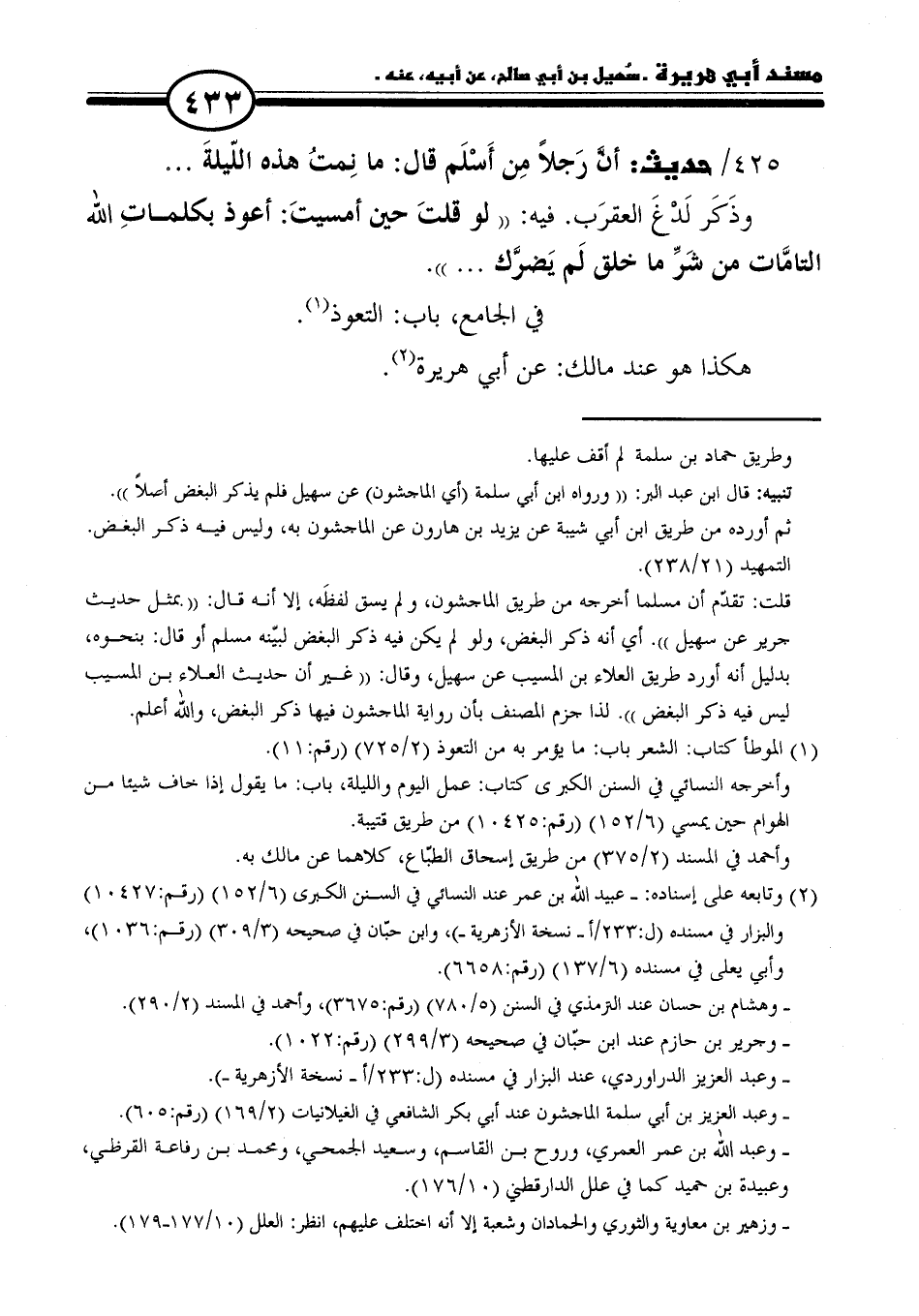 ٤٢٥/ حديث: أنَّ رَجلًا مِن أَسْلَم قال: ما نِمتُ هذه اللّيلةَ. . . وذَكَر لَدْغَ العقرَب. فيه: "لو قلتَ حين أمسيتَ: أعوذ بكلماتِ الله التمامَّات من شَرِّ ما خلق لَم يَضرَّك. . . ".