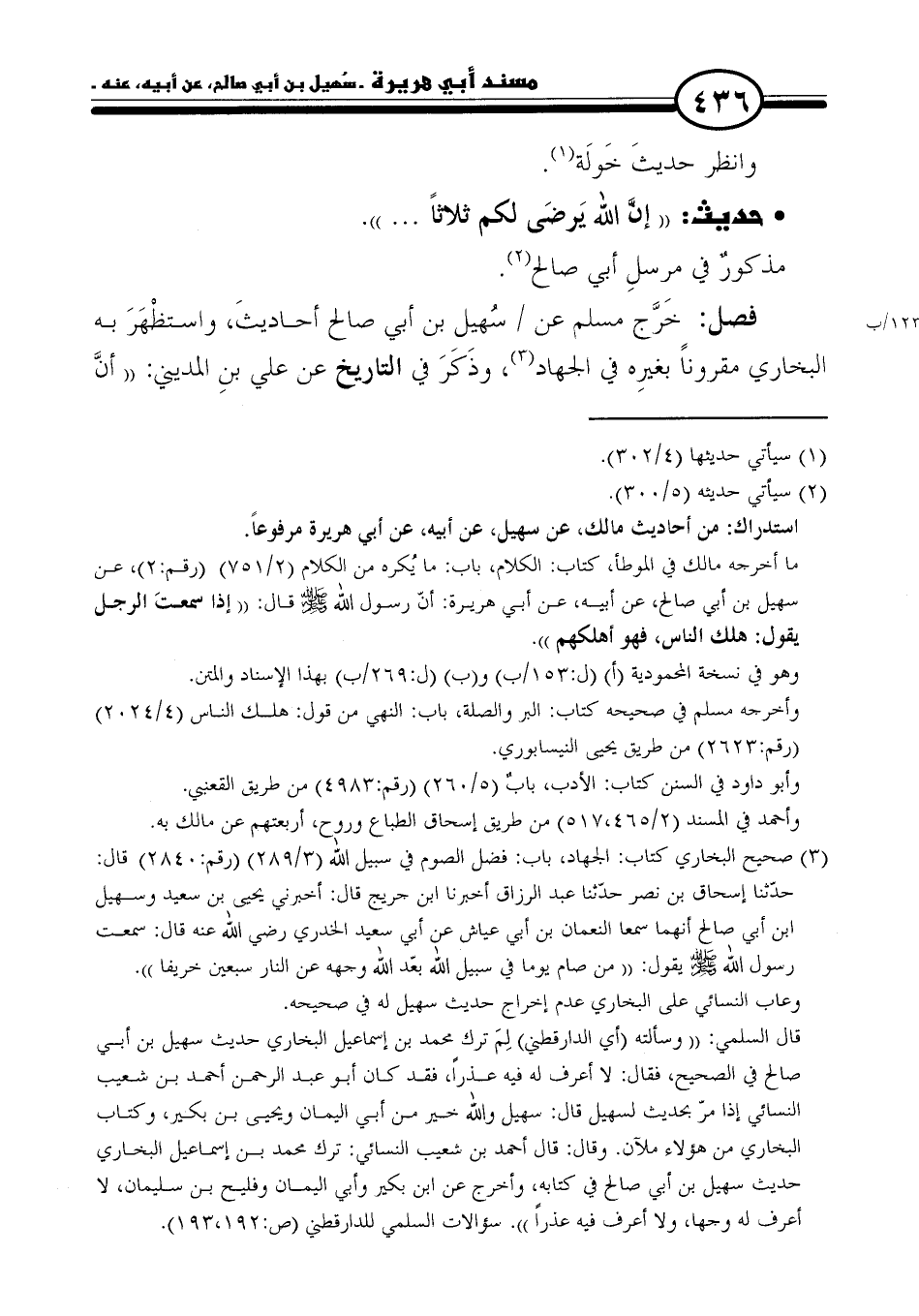 فصل: خَرَّج مسلم عن سُهيل بن أبي صالح أحاديث، واستظْهَرَ به البخاري مقرونًا بغيرِه في الجهاد (٣)، وذَكَرَ في التاريخ عن علي بنِ المديني: "أنَّ