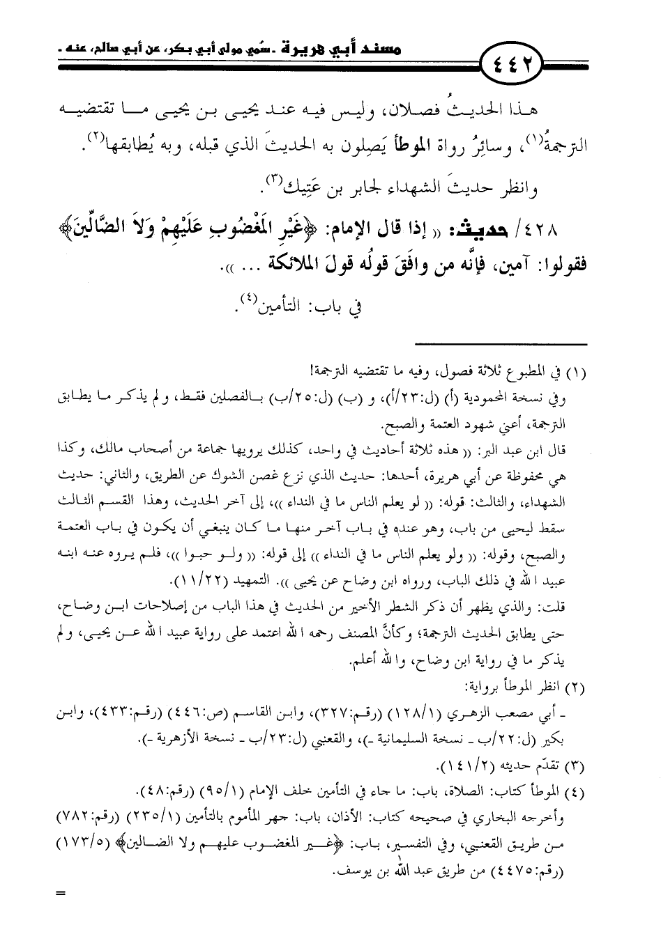 قال ابن عبد البر: "هذه ثلاثة أحاديث في واحد، كذلك يرويها جماعة من أصحاب مالك، وكذا هي محفوظة عن أبي هريرة، أحدها: حديث الذي نزع غصن الشوك عن الطريق، والثاني: حديث الشهداء، والثالث: قوله: "لو يعلم الناس ما في النداء"، إلى آخر الحديث، وهذا القسم الثالث سقط ليحيى من باب، وهو عنده في باب آخر منها ما كان ينبغي أن يكون في باب العتمة والصبح، وقوله: "ولو يعلم الناس ما في النداء" إلى قوله: "ولو حبوا"، فلم يروه عنه ابنه عبيد الله في ذلك الباب، ورواه ابن وضاح عن يحيى". التمهيد (٢٢/ ١١).