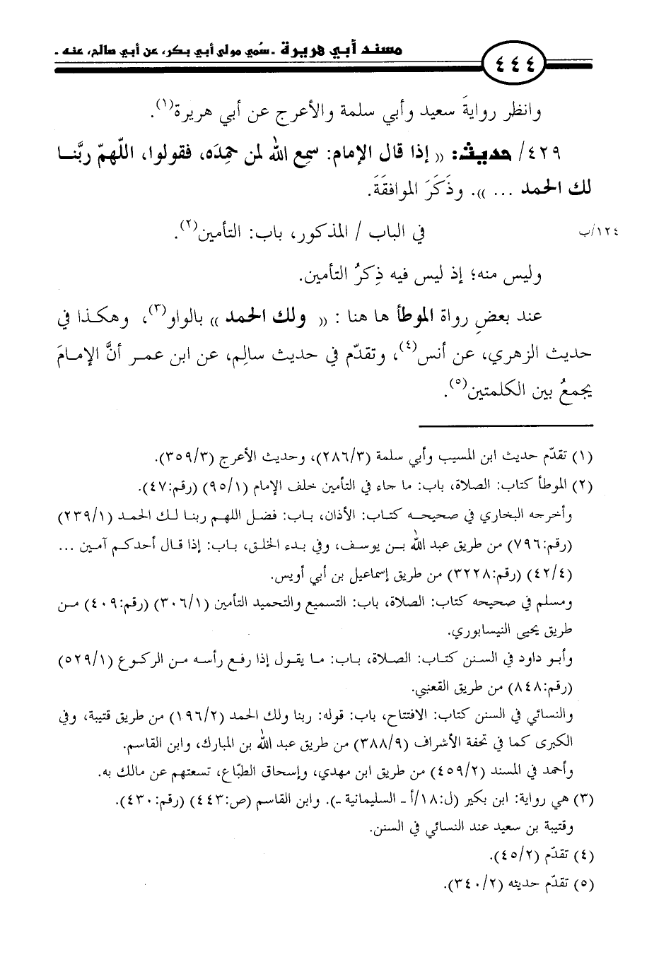 ٤٢٩/ حديث: "إذا قال الإمام: سمِع الله لمن حمِدَه، فقولوا، اللهمّ ربَّنا لك الحمد. . . ". وذَكَرَ الموافقَةَ.