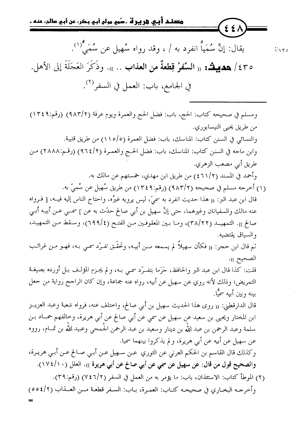 ٤٣٥/ حديث: "السَّفرُ قِطعةٌ من العذاب. . .". وذَكَرَ العَجَلَةَ إلى الأهل.