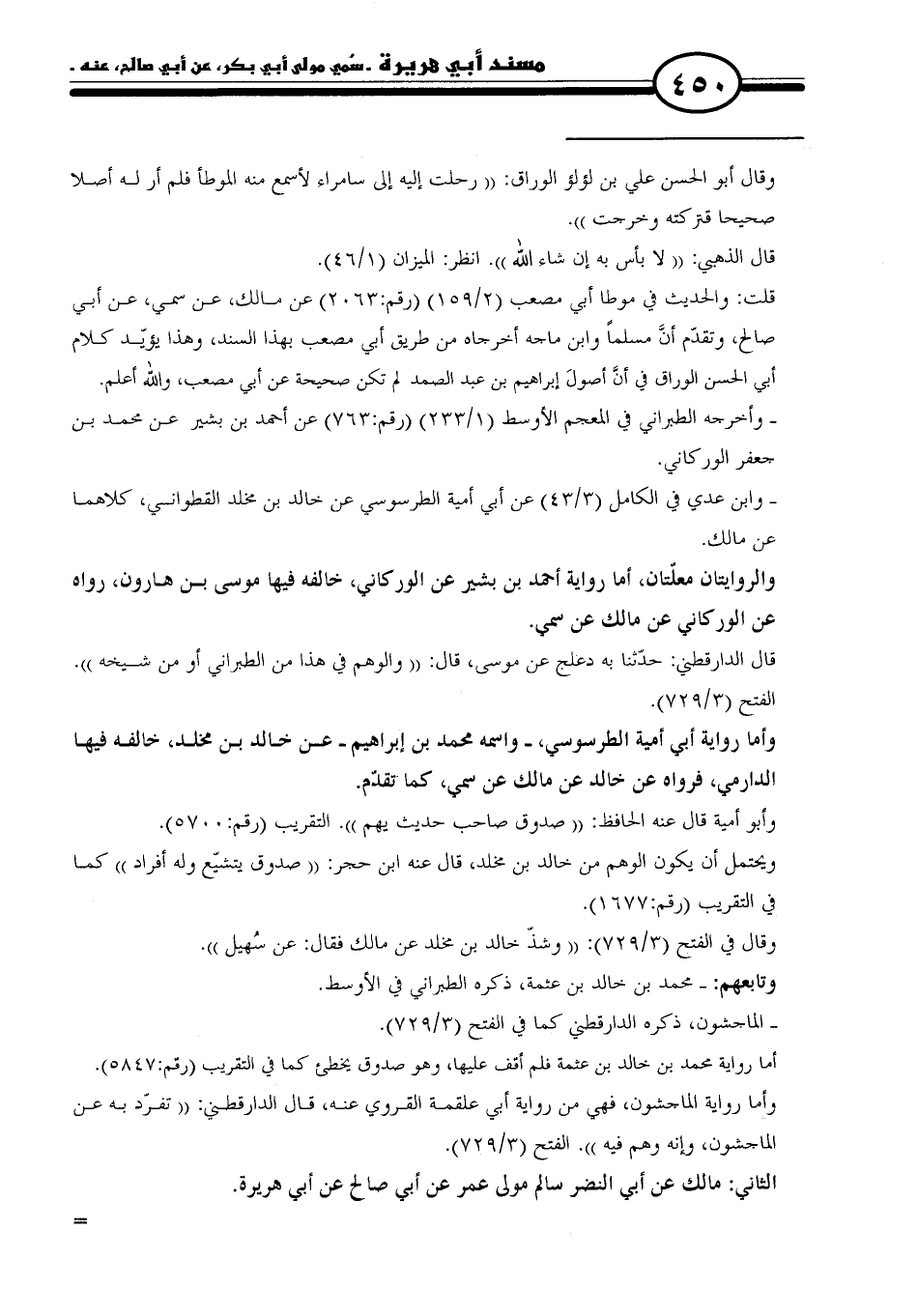 قلت: والحديث في موطأ أبي مصعب (٢/ ١٥٩) (رقم: ٢٠٦٣) عن مالك، عن سمي، عن أبي صالح، وتقدّم أنَّ مسلمًا وابن ماجه أخرجاه من طريق أبي مصعب بهذا السند، وهذا يؤيّد كلام أبي الحسن الوراق في أنَّ أصولَ إبراهيم بن عبد الصمد لم تكن صحيحة عن أبي مصعب، والله أعلم.