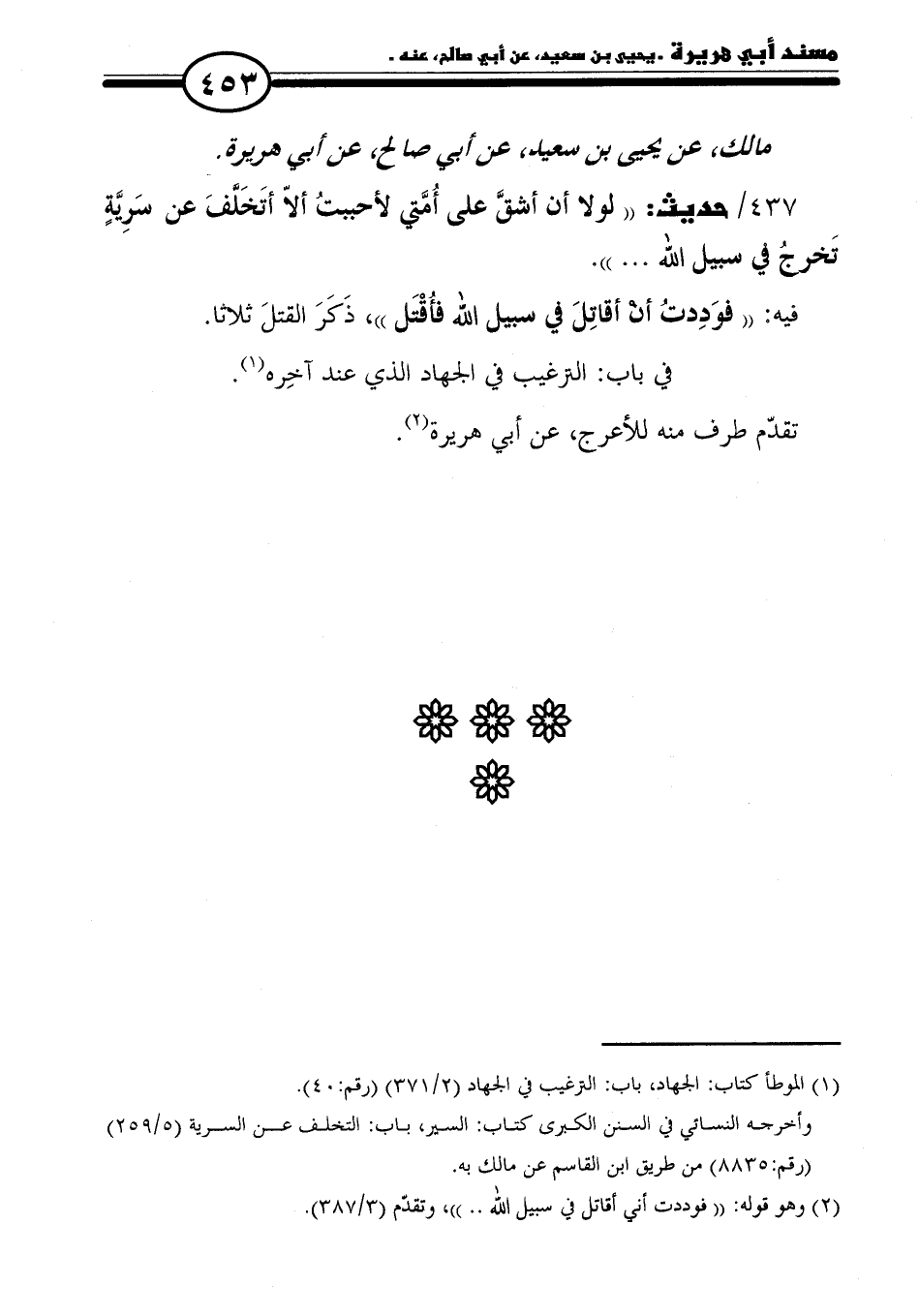 ٤٣٧/ حديث: "لولا أن أشقَّ على أمَّتي لأحببث ألّا أتَخَلَّفَ عن سَرِيَّةٍ تَخرجُ في سبيل الله. . . ".
