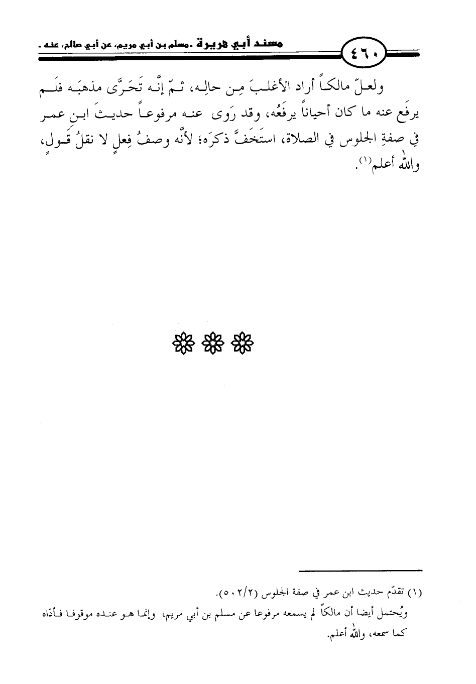 ولعلّ مالكًا أراد الأغلبَ مِن حالِه، ثمّ إنَّه تَحَرَّى مذهبَه فلَم يرفَع عنه ما كان أحيانًا يرفَعُه، وقد رَوى عنه مرفوعًا حديثَ ابنِ عمر في صفةِ الجلوس في الصلاة، استَخَفَّ ذكرَه؛ لأنَّه وصفُ فِعلٍ لا نقلُ قَولٍ، والله أعلم (١).