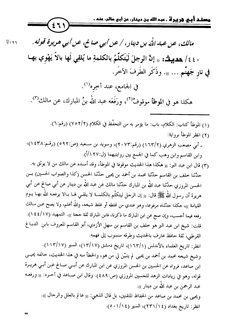 حدّثنا خلف بن القاسم حدّثنا محمد بن أحمد بن يحيى حدّثنا الحسن (كذا والصواب الحسين) بن الحسن المروزي حدّثنا عبد الله بن المبارك حدّثنا مالك عن عبد الله بن دينار عن أبي صالح عن أبي هريرة أن رسول الله - صلى الله عليه وسلم - قال: "إن الرجل ليتكلّم بالكلمة لا يلقي لها بالا يرفعه الله بها يوم القيامة"، هكذا حدّثناه مرفوعا، وهو عندي من غلطه أو غلط شيخه، والله أعلم، ولا يصح عن مالك رفعه فيما أحسب، وإن صح عن ابن المبارك ما ذكرنا، فابن المبارك ثقة حجة". التمهيد (١٧/ ١٤٤). قلت: شيخ ابن عبد البر هو خلف بن القاسم بن سهل الأزدي، أبو القاسم المعروف بابن الدباغ القرطبي، ثقة حافظ عارف بالحديث وطرقه منسوب إلى فهمه.