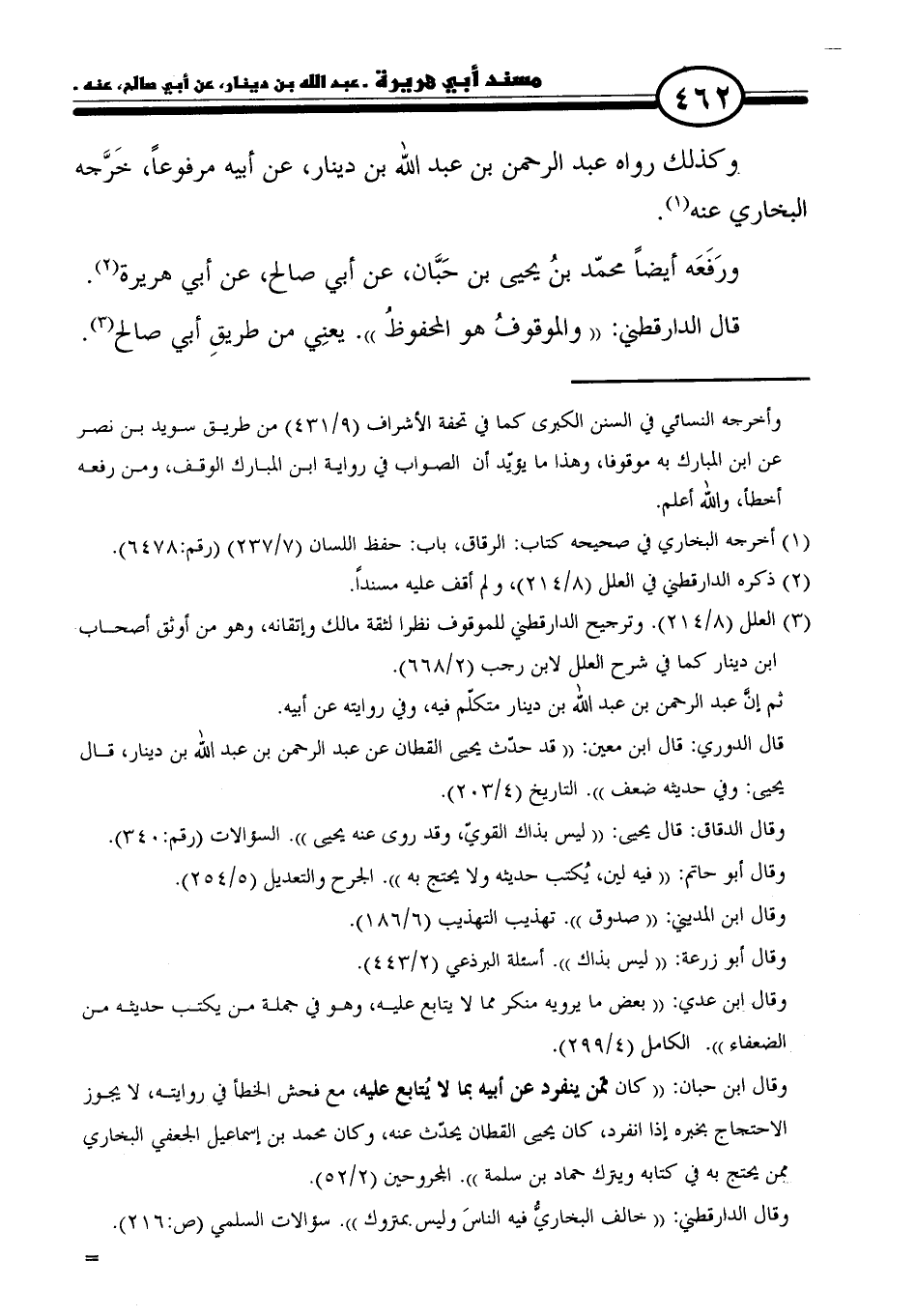 قال الدارقطني: "والموقوفُ هو المحفوظُ". يعنِي من طريقِ أبي صالح (٣).