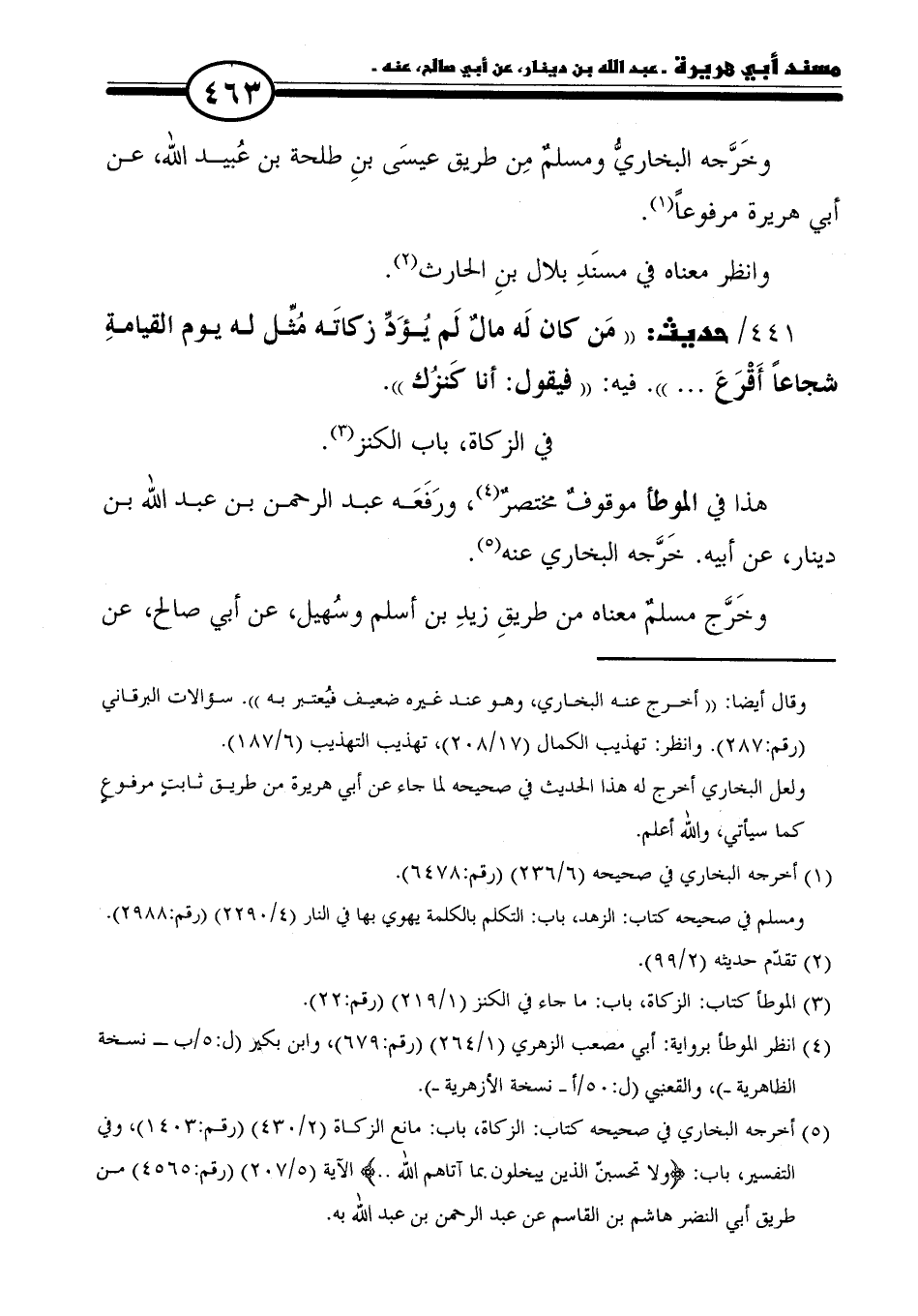 (٥) أخرجه البخاري في صحيحه كتاب: الزكاة، باب: مانع الزكاة (٢/ ٤٣٠) (رقم: ١٤٠٣)، وفي التفسير، باب: {وَلَا يَحْسَبَنَّ الَّذِينَ يَبْخَلُونَ بِمَا آتَاهُمُ اللَّهُ. . .} الآية (٥/ ٢٠٧) (رقم: ٤٥٦٥) من طريق أبي النضر هاشم بن القاسم عن عبد الرحمن بن عبد الله به.