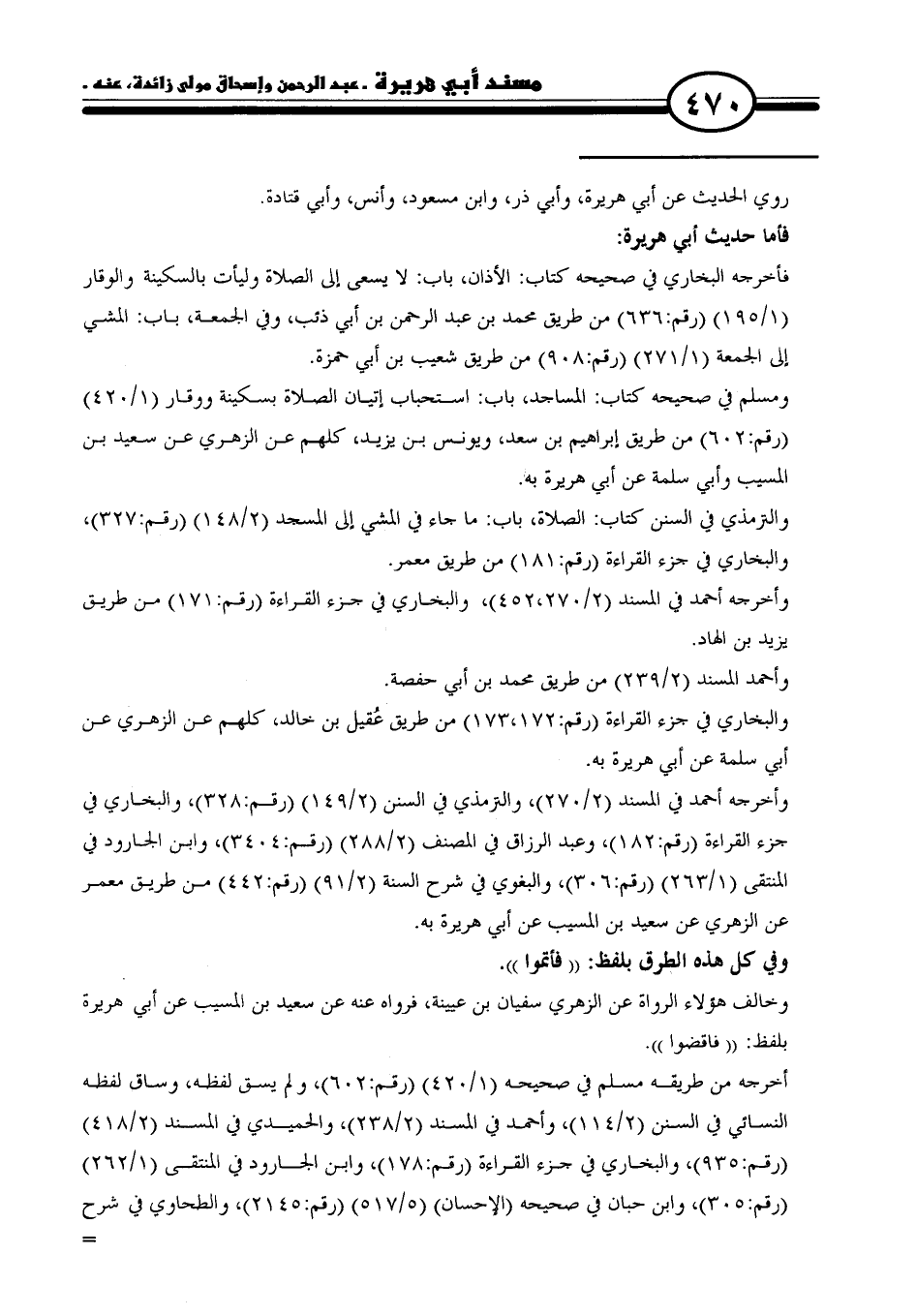 ومسلم في صحيحه كتاب: المساجد، باب: استحباب إتيان الصلاة بسكينة ووقار (١/ ٤٢٠) (رقم: ٦٠٢) من طريق إبراهيم بن سعد، ويونس بن يزيد، كلهم عن الزهري عن سعيد بن المسيب وأبي سلمة عن أبي هريرة به.