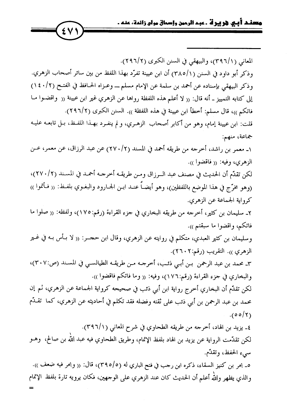 وذكر البيهقي بإسناده عن أحمد بن سلمة عن الإمام مسلم -وعزاه الحافظ في الفتح (٢/ ١٤٠) إلى كتابه التمييز- أنه قال: "لا أعلم هذه اللفظة رواها عن الزهري غير ابن عيينة "واقضوا ما فاتكم"، قال مسلم: أخطأ ابن عيينة في هذه اللفظة". السنن الكبرى (٢/ ٢٩٦).