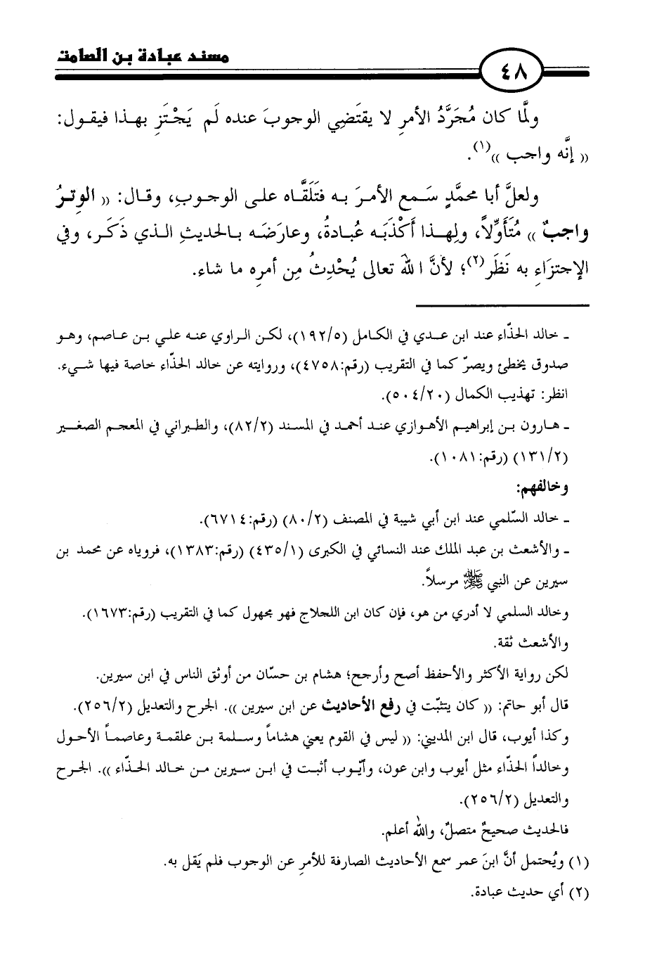 ولعلَّ أبا محمَّدٍ سَمع الأمرَ به فتَلَقَّاه على الوجوبِ، وقال: "الوِترُ واجبٌ" مُتَأَوِّلًا، ولِهذا أَكذَبَه عُبادةُ، وعارَضَه بالحديث الذي ذَكَر، وفي الإجتزَاءِ به نَظرَ (٢)؛ لأنَّ الله تعالى يُحْدِثُ مِن أمرِه ما شاء.
