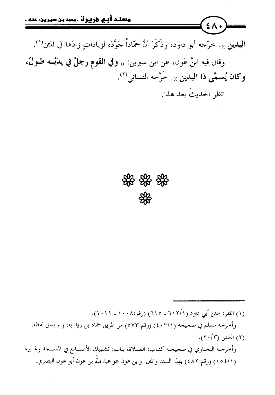 وقال فيه ابنُ عَون، عنِ ابن سيرين: "وفي القومِ رجلٌ في يدَيْه طولٌ، وكان يُسمَّى ذا اليدين". خرَّجه النسائي (٢).