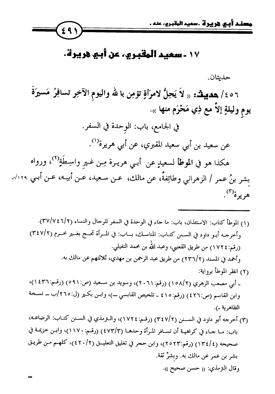 ٤٥٦/ حديث: "لاَ يَحِلُّ لامرَأةٍ تؤمِن بالله واليومِ الآخِر تسافِرُ مَسيرَةَ يومٍ وليلةٍ إلاَّ مع ذِي مَحْرَم منها".